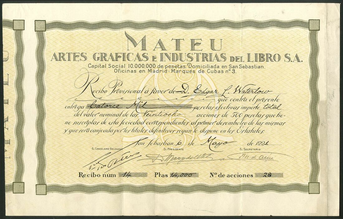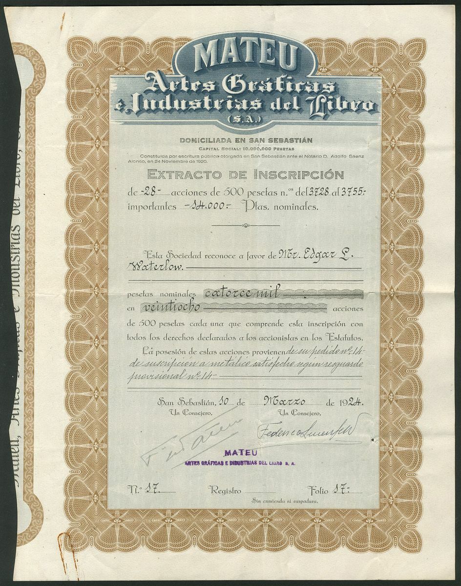 Spain: Mateu Artes Graficas e Industrias del Libro S.A., pair of certificates in the name of Edgar Lutwyche Waterlow, 3rd baronet, for 28 shares of 500 pesetas. The first a Provisional certificate dated 192[1], #14 and the second a nominative certifcate for the same shares, #17. This printing company was based in San Sebastian and the President of the company was, we think, Domingo Merry del Val who signs the first piece. His father was a Spanish nobleman working in the United Kingdom. Domingo was born in London where he probably met the Waterlow family who invested in the company. VF but the second with rusty paperclip mark (2).