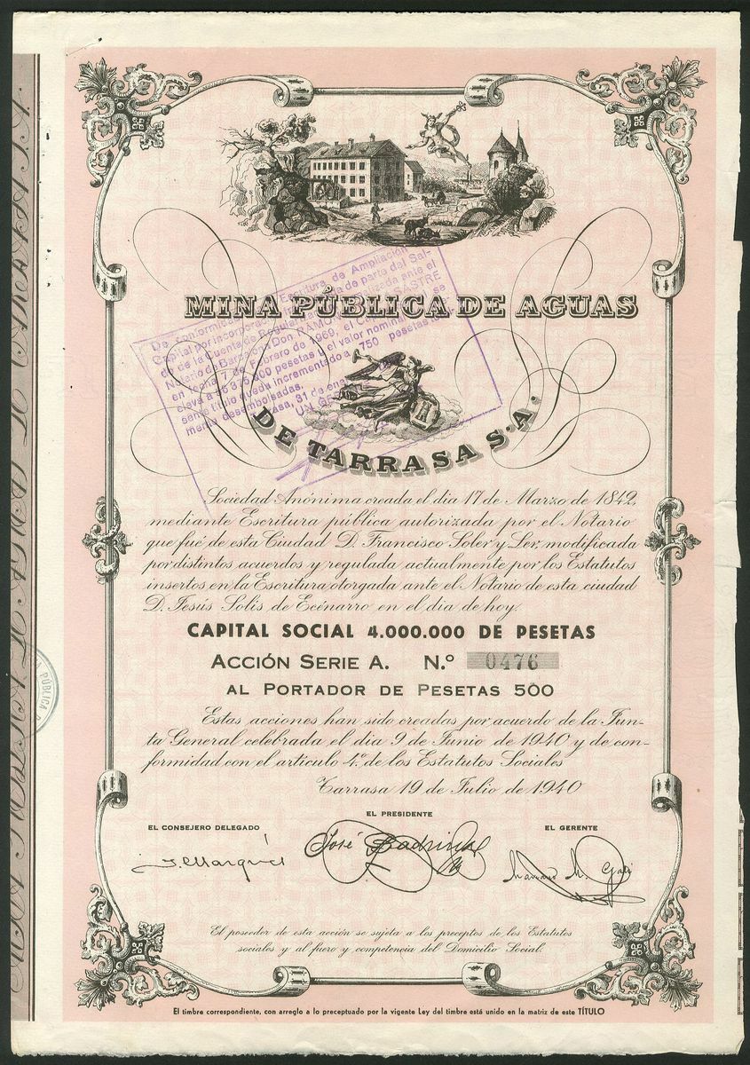 Spain: Mina Publica de Aguas de Tarrasa S.A., 500 peseta share, Carrasa 1940, #476, attractive piece in earlier style (the company was formed in the 1840's) with buildings at top, black, pink underprint. AEF.
