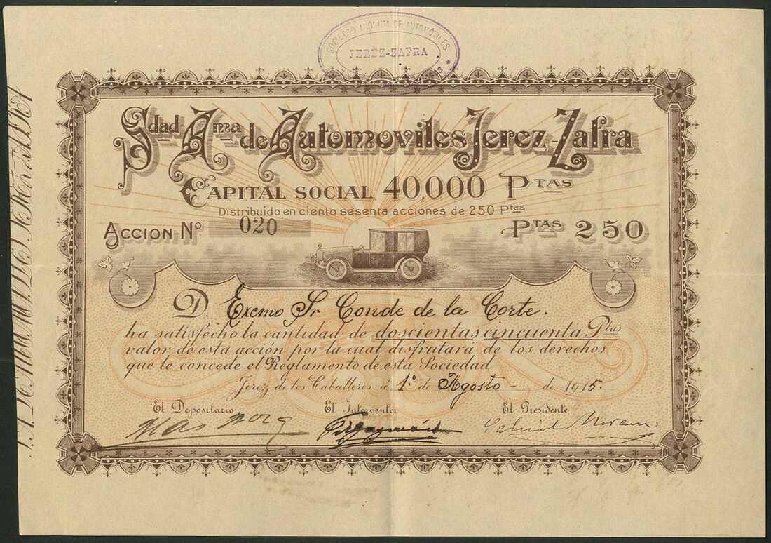 Spain: Sociedad Anonima de Automoviles Jerez-Zafra, 250 peseta share, 191[5], #020, of only 160 issued, vignette of landaulette taxi, brown and yellow. VF and rare.
