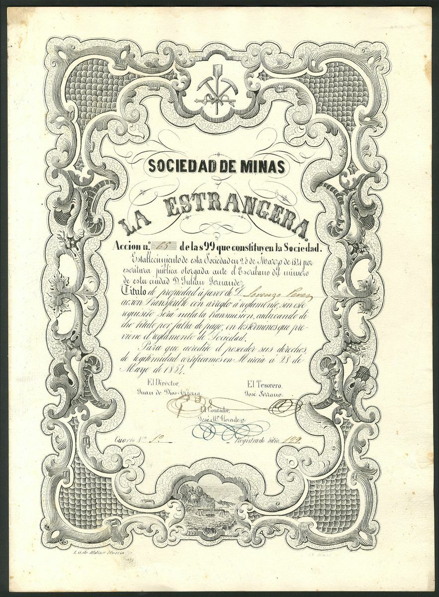 Spain: Sociedad de Minas La Estrangera, share #65, May 1854, attractive piece with heavy scrollwork border with mining tools at top, winding gear at bottom, black, 4 pages. EF.