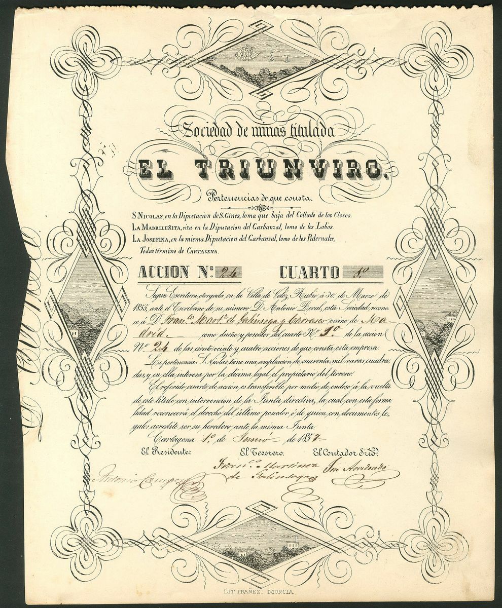 Spain: Sociedad de Minas Titulada El Triunviro, share #24, cuarto 1, Cartagena 185[7], attractive piece with rather crude vignettes of mine buildings and ships at sea, black. Very small tear at top edge otherwise EF.