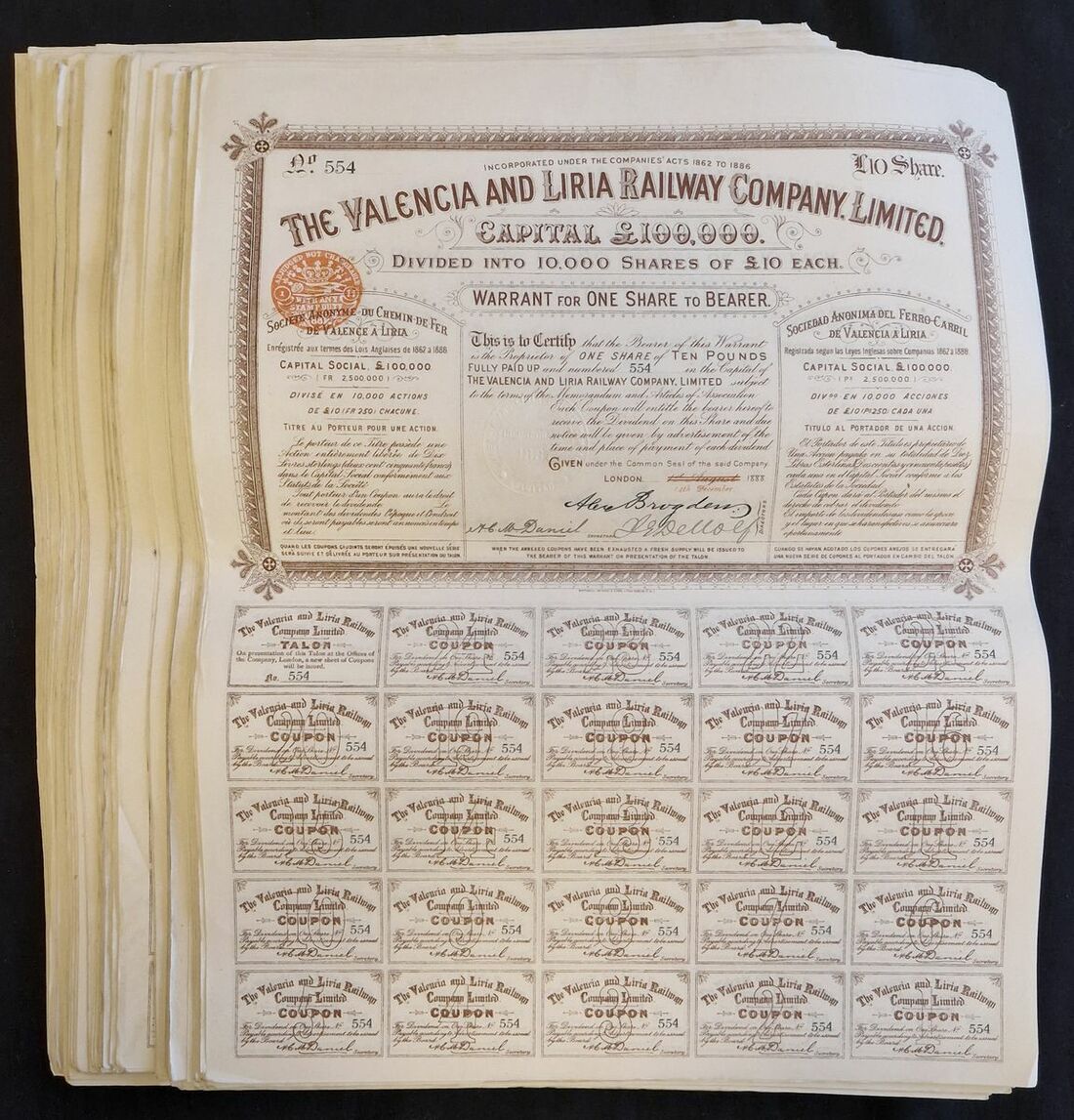 Spain: Valencia and Liria Railway Co. Ltd., a large group of approximately 220 certificates for one share of £10, London 1888, in the range #554 through #793, ornate border, brown, text in English, French and Spanish, with coupons. EF (approx. 220).