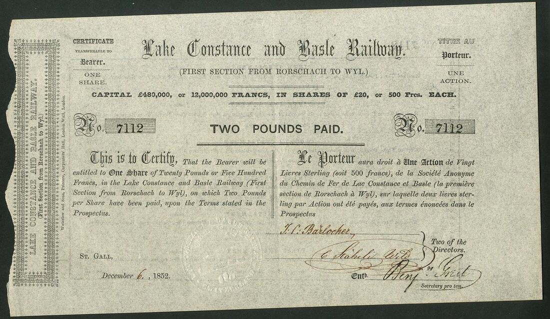 Switzerland: Lake Constance and Basle Railway (First section from Rorschach to Wyl), bearer certificate for one share of £20 or 500 francs, £2 paid, St.Gall 1852, #7108, text in English and French, black, printed by Waterlow & Sons. EF