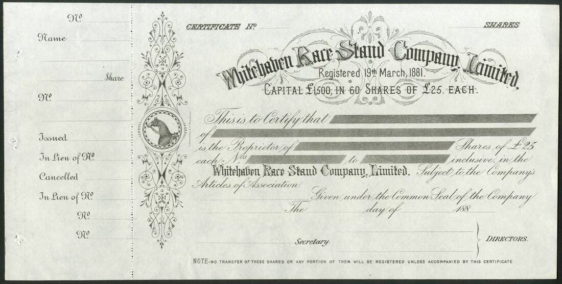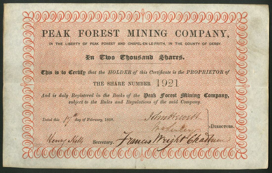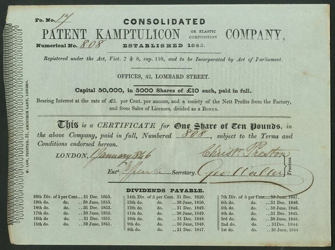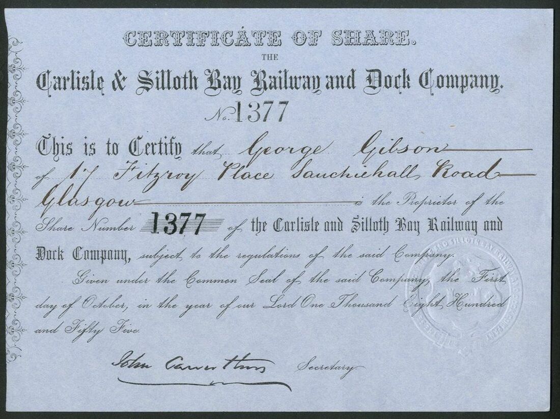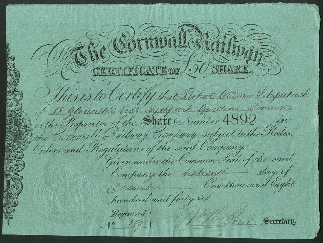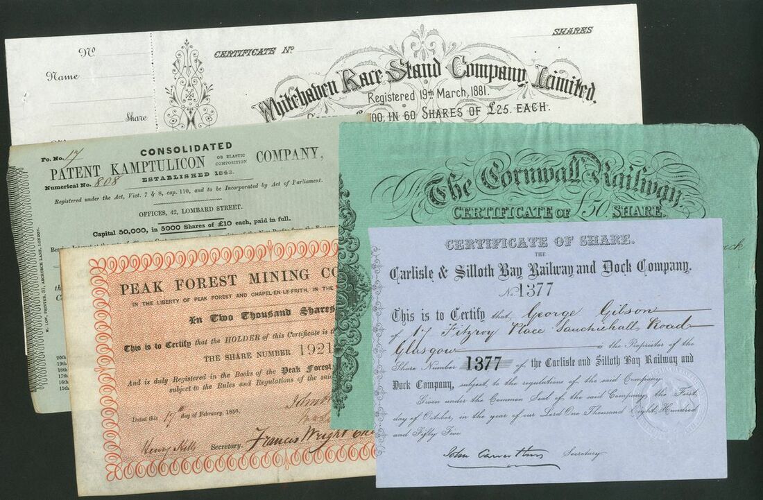 Great Britain: A small group of British certificates, comprising Carlisle & Silloth Bay Railway & Dock Company, 1855, #1377; Cornwall Railway, £50 share, 184[6], #4892; Peak Forest Mining Company, one share, 1858, #1921; Consolidated Patent Kamptulicon or Elastic Composition Company, £10 share, [1846], #17, and Whitehaven Race Stand Co. Ltd., £25 shares, unissued, 188-, with counterfoil. Generally EF (5).