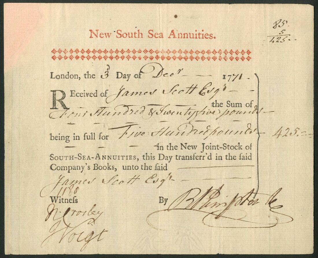 Great Britain: South Sea Company, New South Sea Annuities, inscribed stock receipt, 17[71], for the sale of £[500] of stock at £[425], black and red, 2 rows 35 stars under title. After the collapse of the South Sea Company in 1723 the Government agreed to exchange half of the shareholdings for Government Stock, called South Sea Annuities. In 1733 half of the remaining shares were also exchanged and this gave rise to the New South Sea Annuities. Repaired top left corner otherwise, VF and scarce early date. [R10].