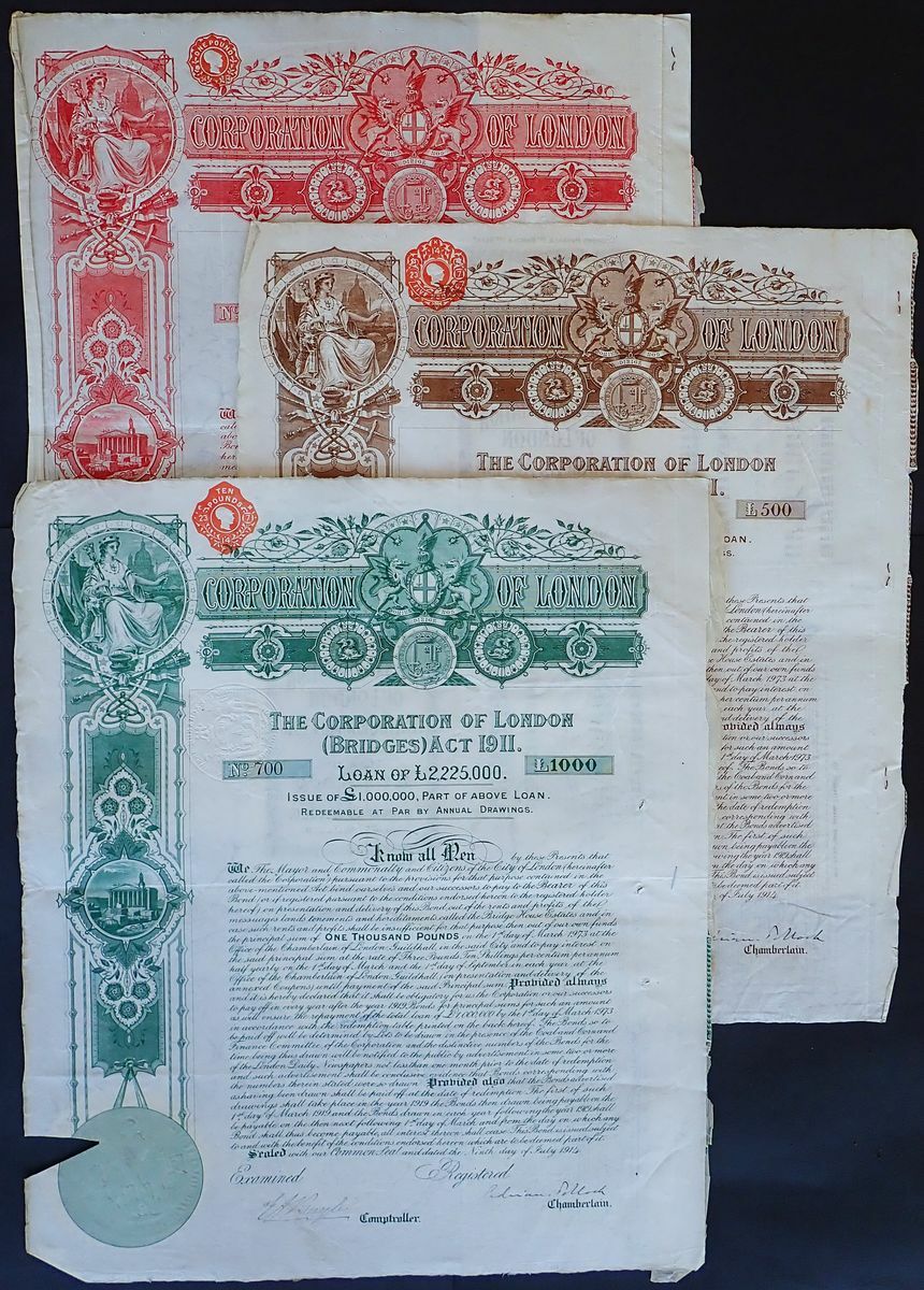 Great Britain: Corporation of London; Bridges Act, 1911, 3½% Loan, a lovely group of bonds for £100 (13), £500 (13) and £1000 (14) issued 1914, large format with Arms of the City at top, allegory of the Queen at top left, Royal Exchange building at left, all within ornate scrollwork, red, brown and green respectively, with coupons, cancelled by triangular cut into seal at lower left and by handstamp on the reverse. Most are VF (40)