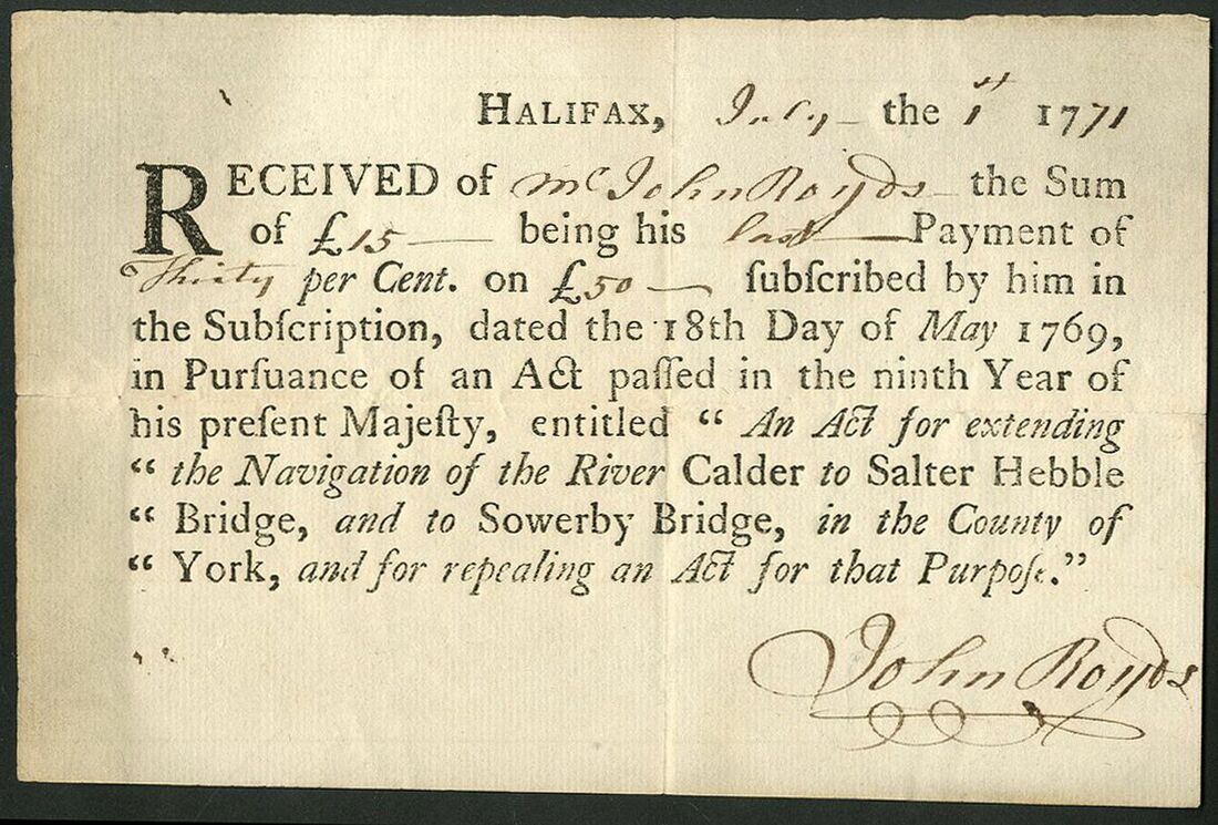 Great Britain: Calder & Hebble Navigation, receipt for £[15], Halifax 17[71], for subscription to fund for extending the navigation under Act of Parliament of 1769. Small format, black printing. Signed by John Royds, 1720-1781, wealthy wool and cloth merchant and banker. VF and rare.