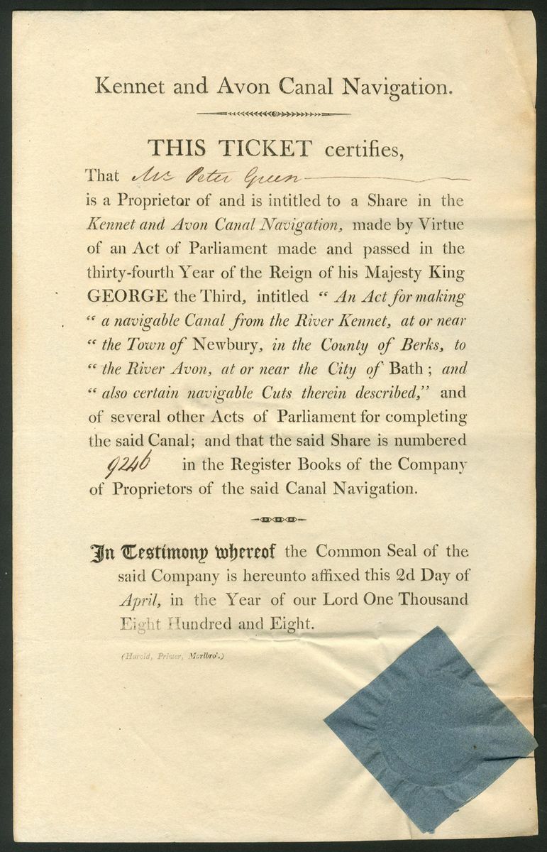 Great Britain: Kennett and Avon Canal Navigation, one share, 1808, #9246, folio format, black, blue paper seal at bottom right. GVF.