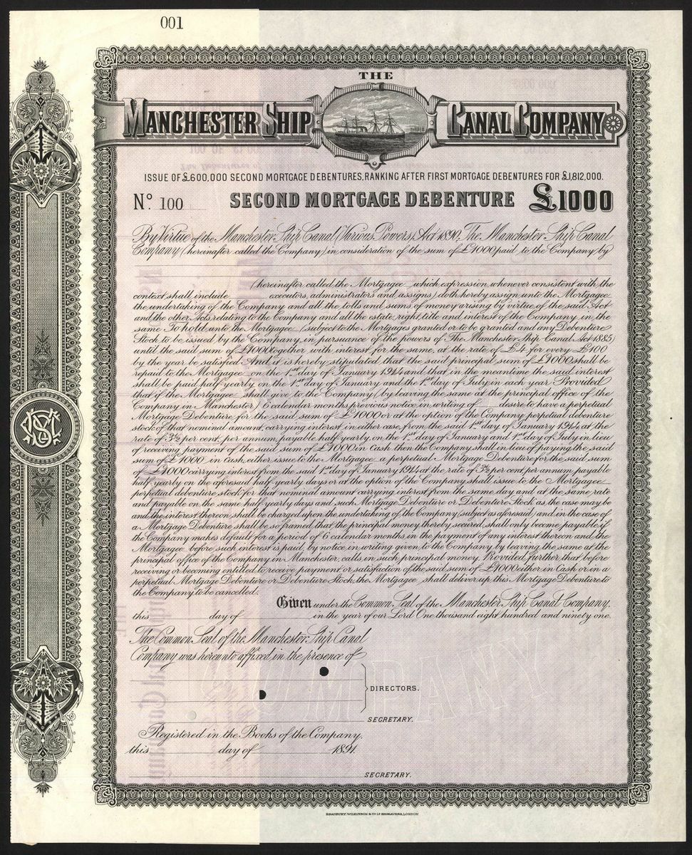 Great Britain: Manchester Ship Canal Company, 4% Second Mortgage debenture for £1000, 1891, a specimen certificate from the Bradbury, Wilkinson & Co. archive, large format with vignette of steamship at top, ornate border, black with pink underprint, number 001 in margin, small hole cancels in signature area. EF.