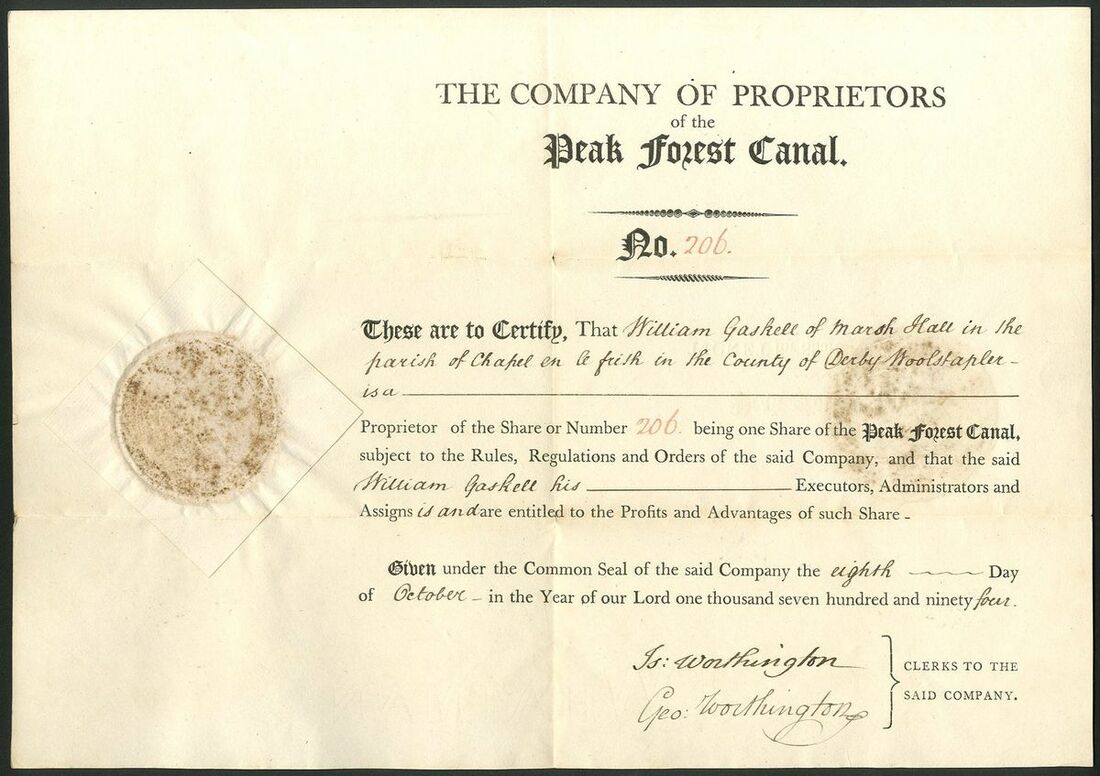 Great Britain: Peak Forest Canal (Company of Proprietors of the ..), one share, 179[4], #206, black, paper seal to left. A 14.8 mile narrow canal built from 1794 and opened in 1796 connecting Dukinfield, Manchester to Buxworth. Fell into disuse in the 1920's but like many canals has been restored and reopened by enthusiasts. GVF and rare.