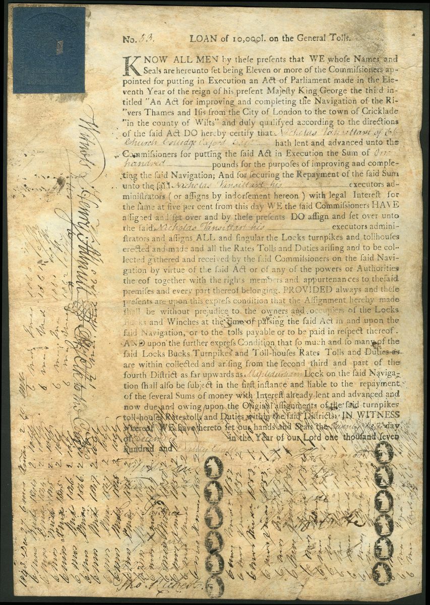 Great Britain: Rivers Thames and Isis Navigation, a 4½% bond for £100, 17[88], #53, issued to Nicholas Vansittart, later to become England longest serving Chancellor of the Exchequer, black printing, on vellum, 12 signatures of the Commissioners, each with small wax seal, interest payments annotated on the back and front of the piece from 1789 through to 1863, sometimes across the printed text, a few endorsements on the reverse. An Act of Parliament was passed in 1771 for 'improving and completing' the navigation of the Thames and Isis Rivers from the City of London to Cricklade in Wiltshire. Commissioners were appointed who promptly raised the necessary funds with these bonds. Interest was paid at 4½% which was paid out of income derived from rates, tolls and duties charged at Locks, Toll Houses and Turnpikes. The navigation was vested in the Thames Concervancy from 1866 when it was considered that the locks and other structures were considered to be in a poor state of repair and there was insufficient income for proper maintenance. This got rid of the rather ancient and unwieldy regulation by the numerous commissioners. Vellum a little discoloured as usual, VF and very rare