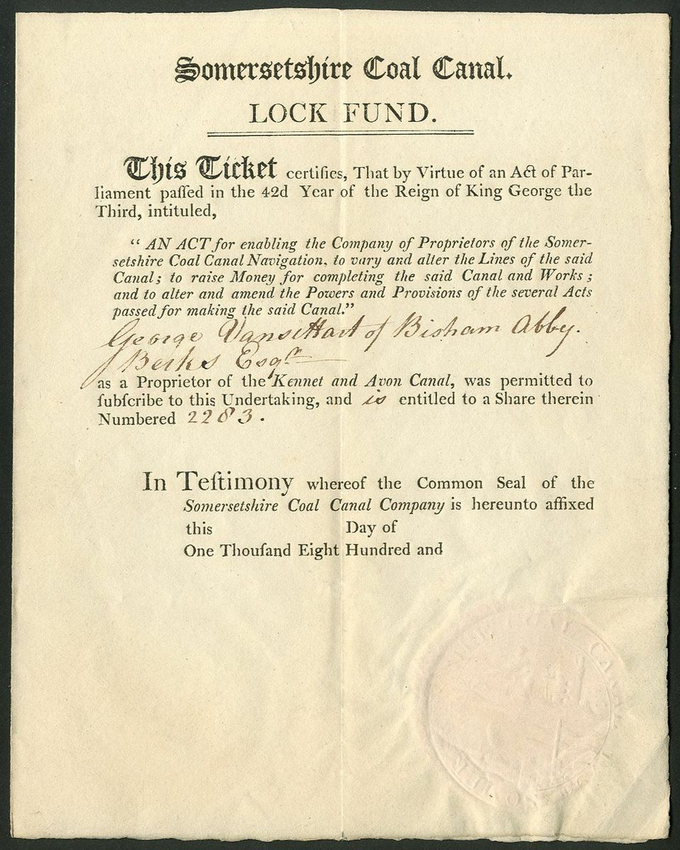 Great Britain: Somersetshire Coal Canal, Lock Fund, certificate for one share, 180[?], #2283, date omitted in error, black printing, seal at bottom right. Only shareholders in the Kennet & Avon Canal were permitted to subscribe to this undertaking.GVF and scarce.