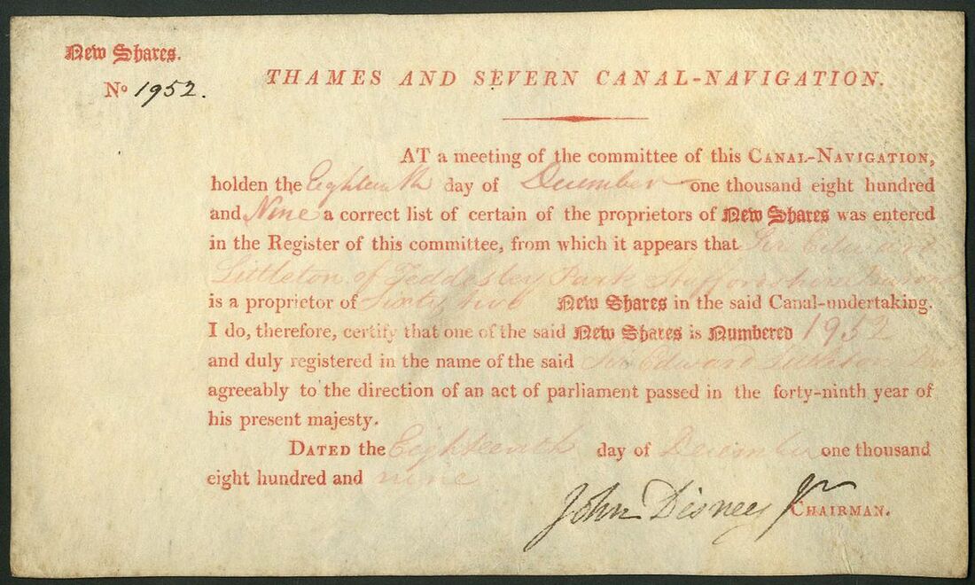 Great Britain: Thames & Severn Canal Navigation, New shares, 180[9], #1952, small format, red printing, on vellum, signed by John Disney Jr. as Chairman. The canal connected the River Thames at Lechlade to the Stroudwater navigation near Stroud, Gloucestershire and was completed in 1789. AVF.