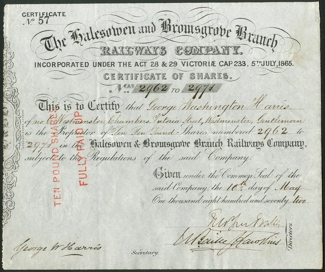 Great Britain: Halesowen and Bromsgrove Branch Railways Company, £10 shares, 187[2], #57, black, stamped in red