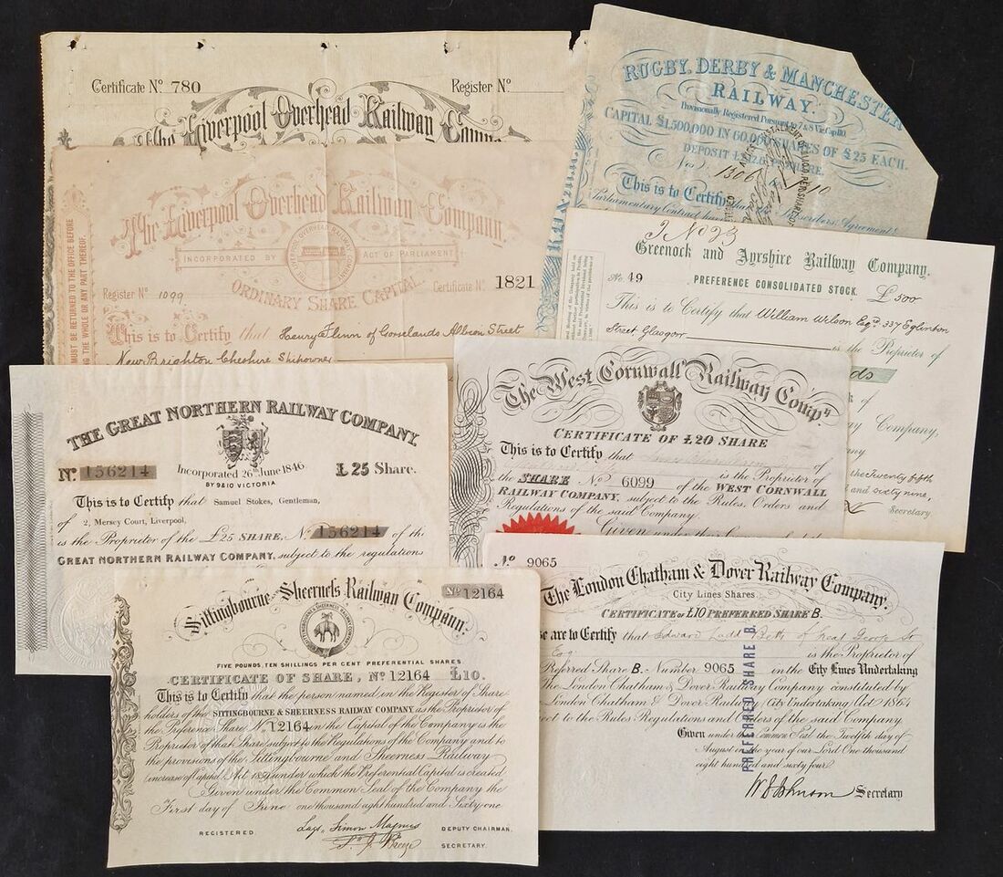 Great Britain: Sittingbourne and Sheerness Railway Company, 5½% preference share of £10, 1861, #12164, together with other British Railways including London, Chatham & Dover Railway Company, City Lines shares, 1864, and West Cornwall Railway Company, 184[6], this damaged, with bottom left corner torn away, and others (5). The first 2 are EF, the remainder fine and better (8).