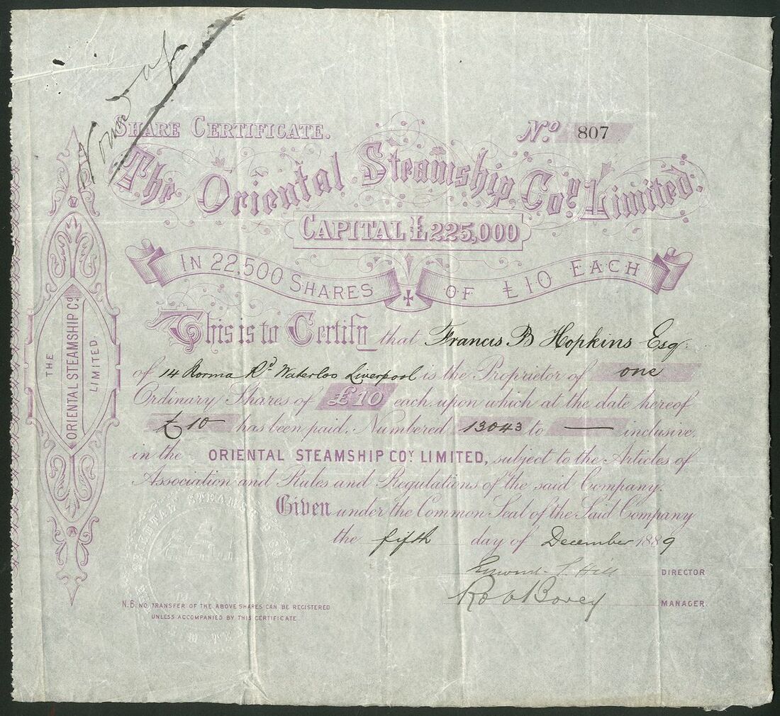 Great Britain: Oriental Steamship Co. Ltd., £10 shares, 188[9], #807, mauve printing. Registered 6th September 1886. Liquidated in 1894. We sold an earlier example last year the only difference is that the inverted commas around ORIENTAL have now been removed. Creasing, F-VF.