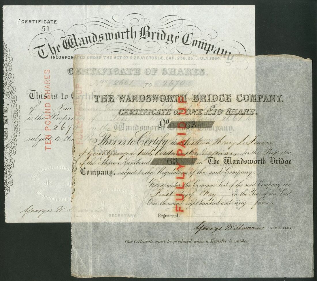 Great Britain: Wandsworth Bridge Company, pair of certificates for £10 share, 186[5], #63, black on thin paper, red 'FULLY PAID UP' on face and £10 shares, 187[2], #51, black. The first bridge was completed in 1873 and was of 5 span lattice-girder construction, as illustrated on the company seal. Built by J.H. Tolme, this bridge across the Thames was taken over by the Metropolitan Board of Works and made free of tolls, like many other London bridges, in 1880. It was replaced in 1940 by the present structure. AEF (2).