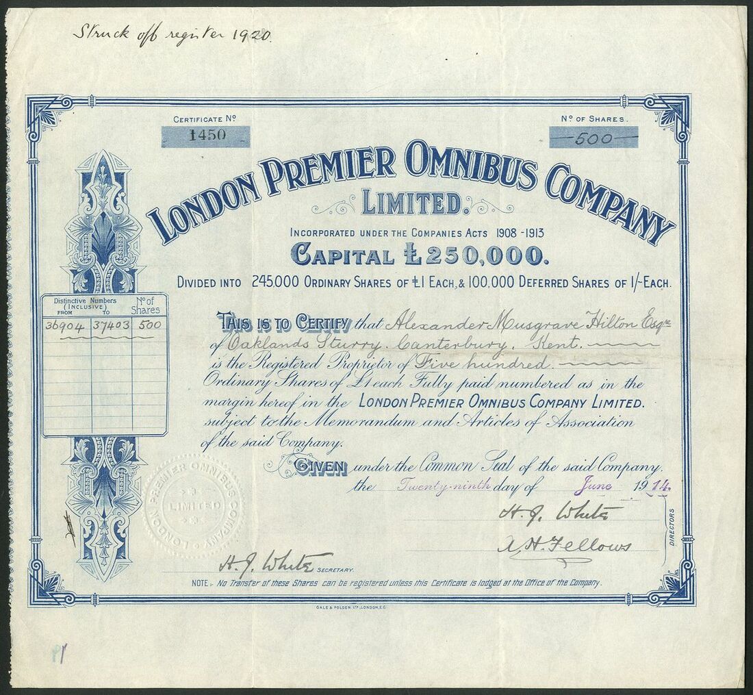 Great Britain: London Premier Omnibus Co. Ltd., £1 ordinary shares, fully paid, 19[14], #1450, scrollwork at left, blue. Registered as Premier Omnibus Co. Ltd. in 1912, name changed in 1914. Operated a fleet of De Dion Motor buses in London and environs. GVF.