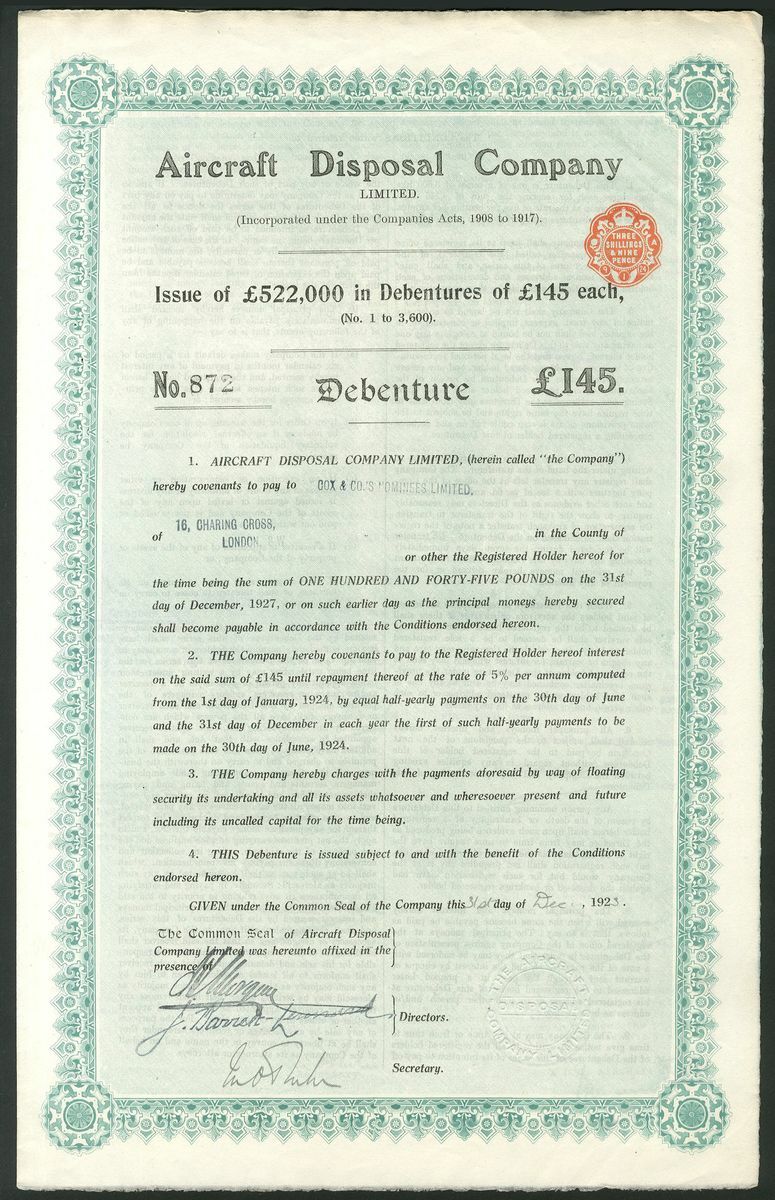 Great Britain: Aircraft Disposal Company Ltd., 5% debenture, £145, 192[3], #872, large format 4 page document with ornate border, green and black. Formed in 1920 to acquire surplus aircraft and spares belonging to the declining RAF with its main store at Waddon aerodrome, Croydon, Surrey. Name changed to ADC Aircraft Limited in 1925. Modifications were made to various machines and in 1926 several ADC 1's were sold to Latvia. Liquidated in 1930. EF.
