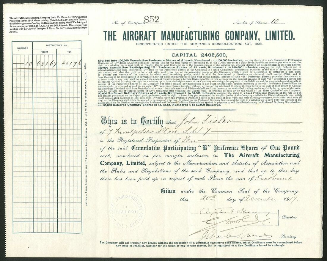 Great Britain: Aircraft Manufacturing Co. Ltd., £1 'B' preference shares, 19[17], #852, Established in 1912 and grew rapidly during WWI known by its acronym of AIRCO. Controlled by George Holt Thomas, The designs of its aircraft were by Geoffrey de Havilland, later to create a company of his own and were designated DH. By the end of WWI it employed some 4400 people but was liquidated in 1920 after war work had diminished the company's business. The assets were acquired by de Havilland and he formed De Havilland Aircraft Company Limited. VF.