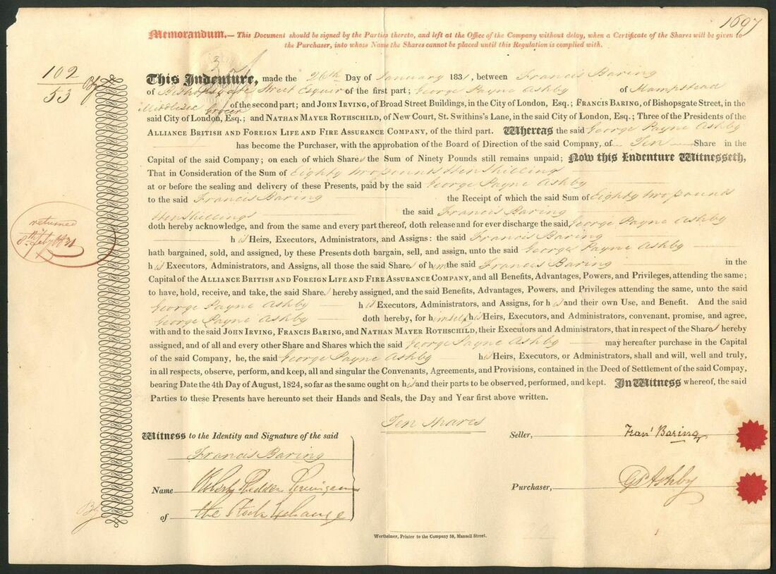 Great Britain: Alliance British and Foreign Life and Fire Assurance Company, an interesting printed transfer certificate, 183[1], between Francis Baring as seller and George Payne Ashby as buyer for 10 shares. Signed by both Francis Baring and George Ashby. Ashby was a wealthy draper of Hampstead, London. Francis Baring, son of Thomas Baring, 2nd Baronet and grandson of the founder of the London banking company, 1796-1866, third baronet from 1848, created Baron Northbrook from 1866. Mainly involved in politics, he was a Lord of the Treasury from 1830, and was Chancellor of the Exchequer 1839 to 1841. The Alliance was formed in 1824 by Nathan Rothschild and Moses Montefiore along with Francis Baring, Samuel Gurney and John Irving. The company acquired many other corporations before merging with the Sun Insurance (formed in 1720) to form Sun Alliance which in turn merged with the Royal Insurance to form Royal Sun Alliance. VF and scarce early piece.