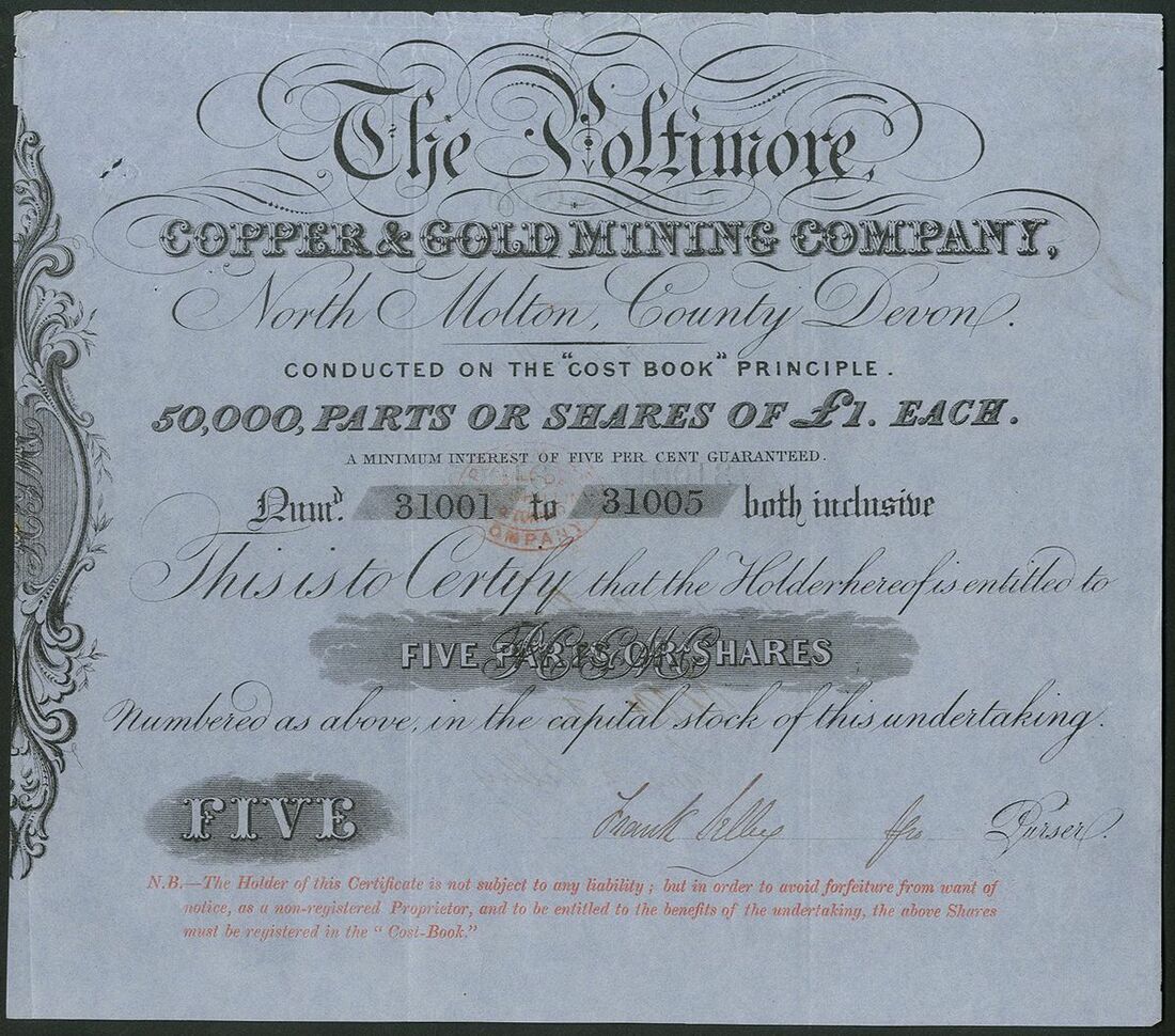 Great Britain: Poltimore Copper & Gold Mining Company, North Molton, Devon, 5 shares of £1, undated as usual but certainly 1852, black on blue paper. A cost book company which was fairly standard at this date prior to the introduction of Limited Liability especially in the 1852-3 mining boom. Gold mining  in this county, however, is rare. EF.