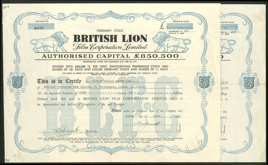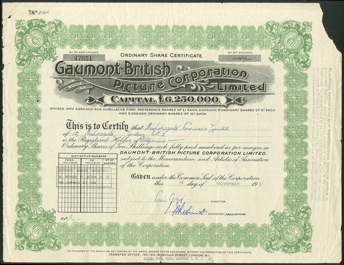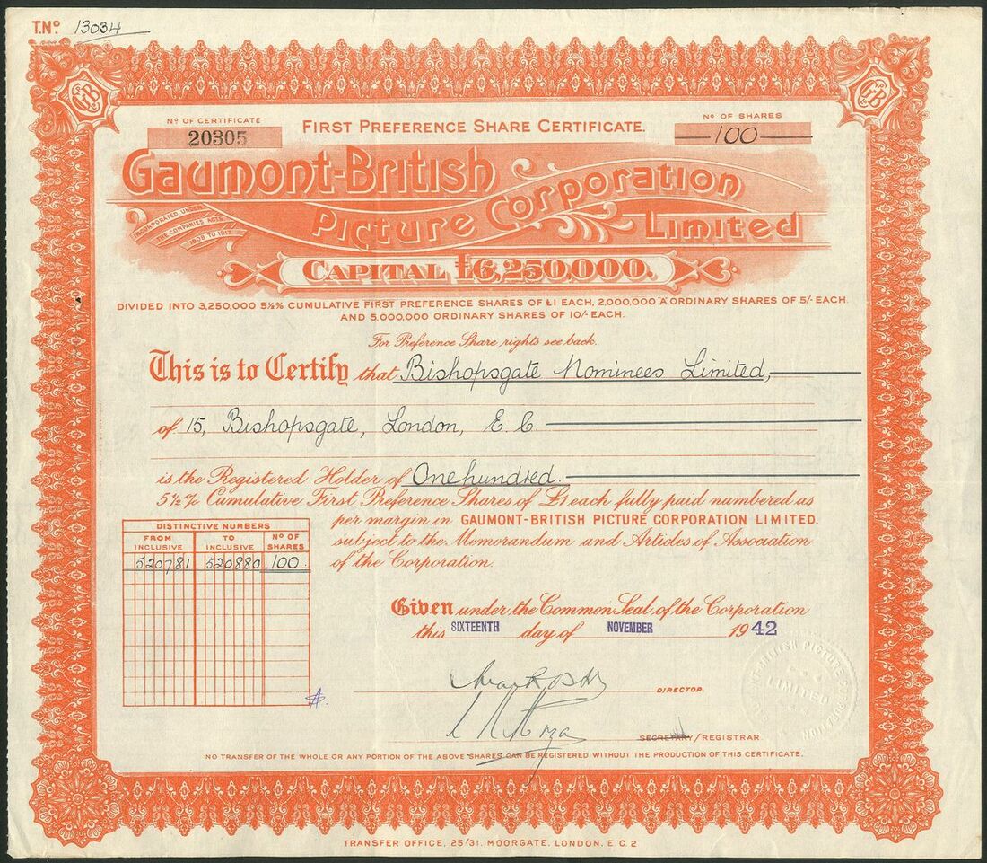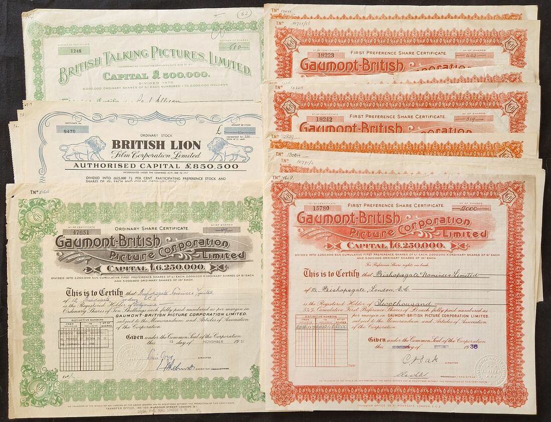 Great Britain: Gaumont-British Picture Corporation Ltd., £1 5½% preference shares, 19[36] to 19[42], 13 examples and ordinary shares, 19[51], green (damaged); together with British Lion Film Corporation Ltd., ordinary stock, 5 examples dated 19[48] and 19[49], blue, and British Talking Pictures Ltd., 19[29], green, 2 examples. Gaumont was the British branch of the French film company Gaumont. Gained independence in 1922 following Isidore Ostrer's acquisition of the majority of shares. The company's Lime Grove Studios produced Alfred Hitchcock's 1935 version of The 39 Steps, and The Lady Vanishes in 1938. Acquired by the Rank Organisation in 1941. Generally VF (21).