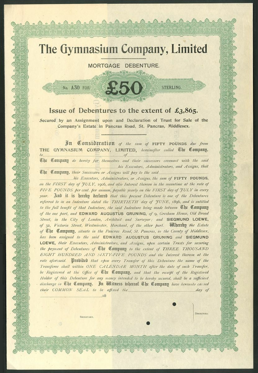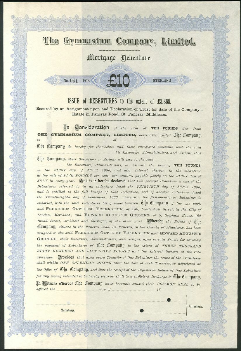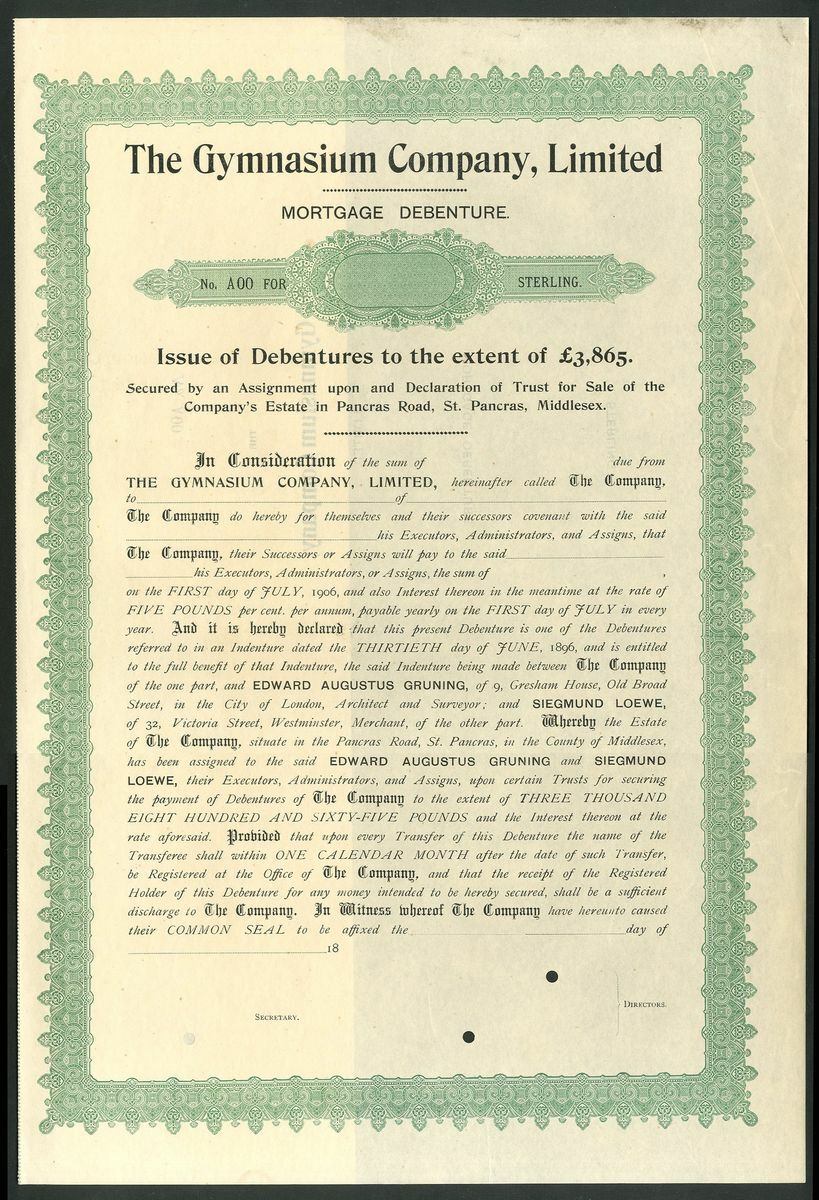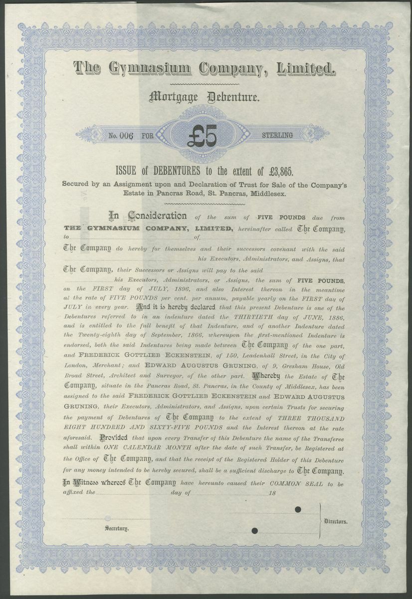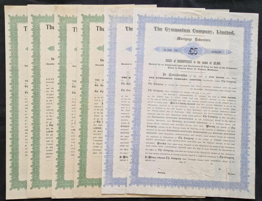 Great Britain: Gymnasium Company Limited, 6 x specimen mortgage debentures from the Bradbury, Wilkinson archive comprising £5 and £10, circa 1886, blue and £10, £50, £250 and 'various', circa 1896, green, all large format. The company owned the building in St.Pancras used by the German Gymnastic Society which was formed in 1867. All EF and rare (6).