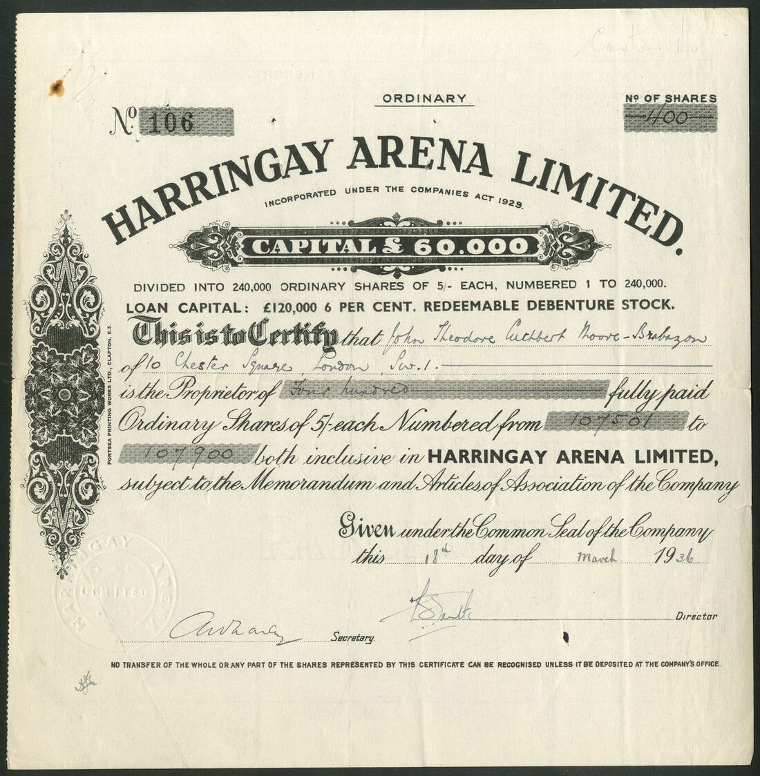 Great Britain: Harringay Arena Limited, 5/- ordinary shares, 19[36], #106, scrollwork at left, black. Built in 1936 to host various sporting and other events but became best known for ice hockey and boxing. It hosted both basketball and wrestling events for the 1948 Olympics and was the home of the Horse of the Year show 1949 to 1958, the year the Arena closed. VF and rare.