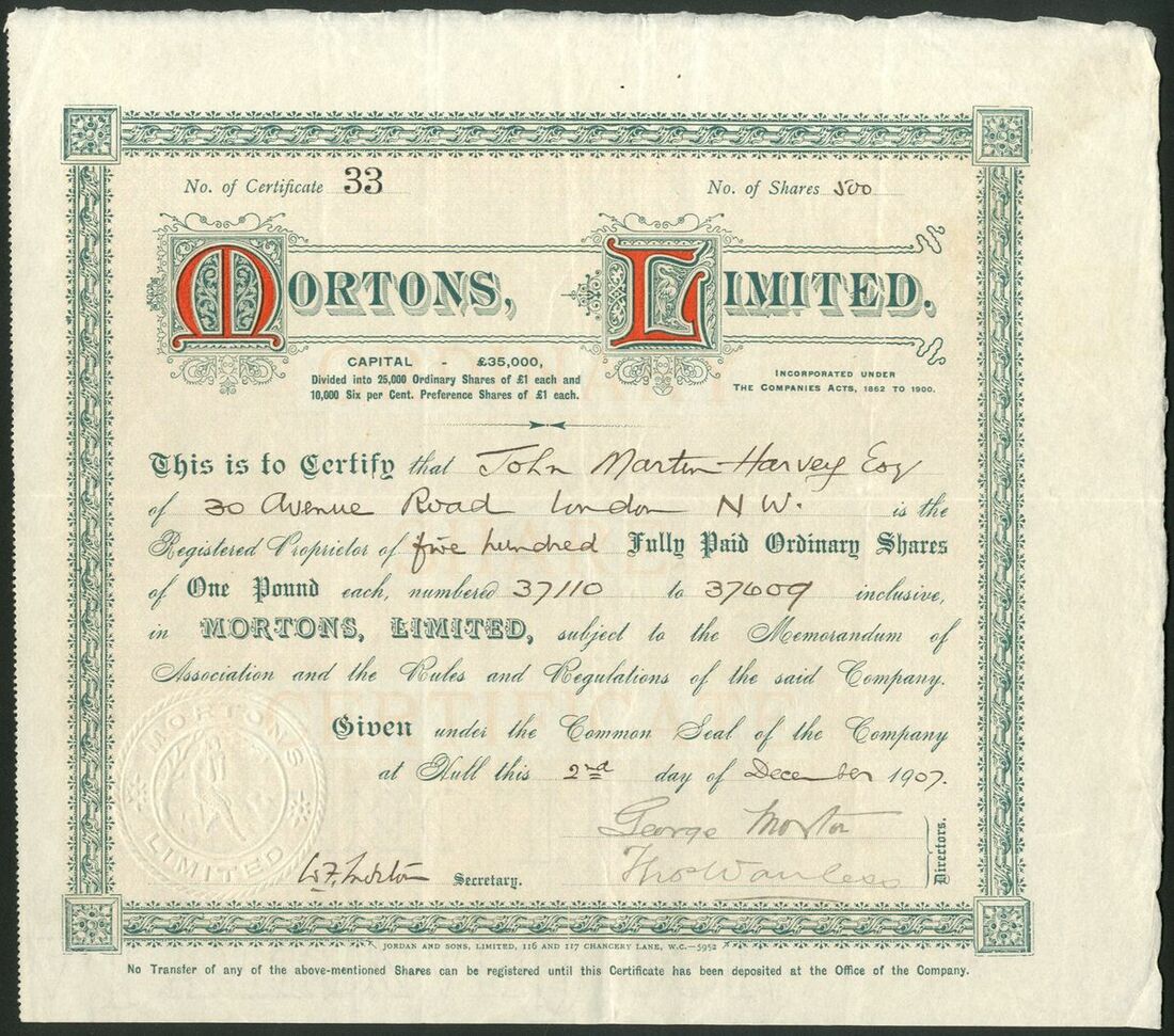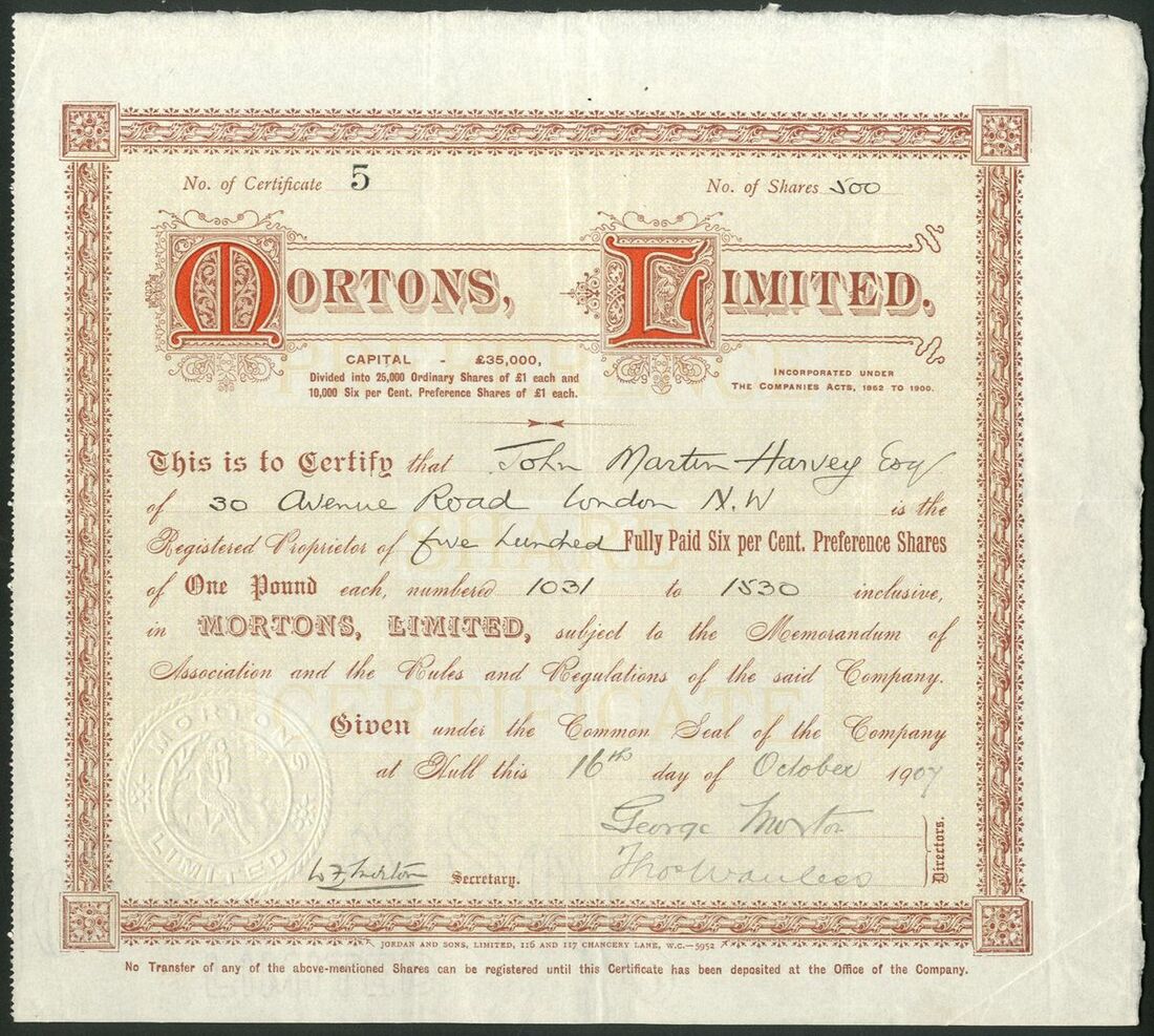 (x) Great Britain: Mortons Limited, pair of certificates, 19[07], for Ordinary shares, #33, green and Preference shares, #5, brown. Formed by William Morton to acquire an option to buy the Grand Theatre, Hull. He already owned the Alexandra Theatre in the town. VF (2).