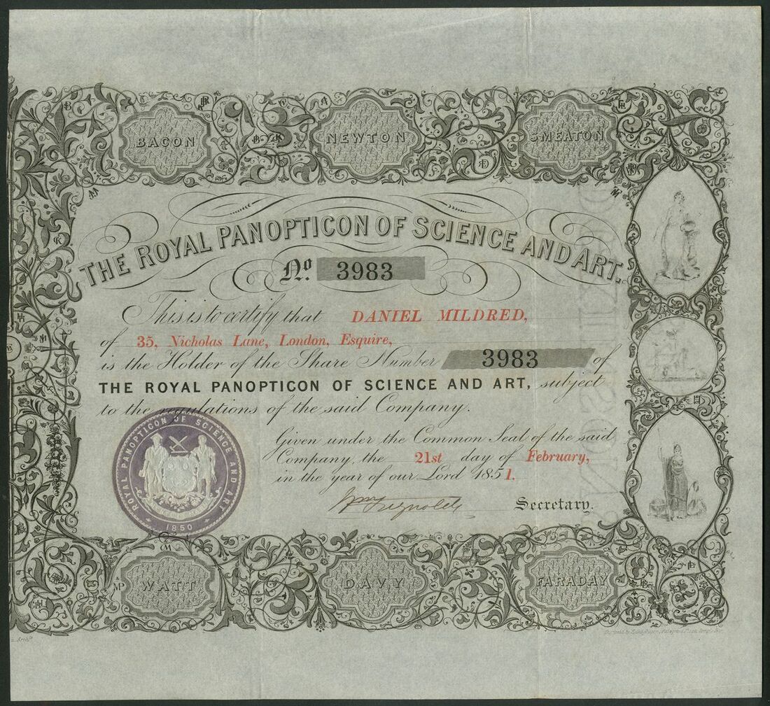 Great Britain: Royal Panopticon of Science and Art, certificate for one share, 185[1], #3983, issued to Daniel Mildred, partner in the private Bank of Mastermans in London, very ornate border with small vignettes of allegorical figures, names of famous scientists in medallions such as Newton, Watt, Faraday and Davy, black, mauve embossed seal. A large and impressive structure in Moorish style, erected in Leicester Square, to hold scientific exhibitions. The building opened in 1854 just before the outbreak of the Crimean War and the company failed within 2 years. Sold and turned into the Alhambra. The Odeon cinema now stands on the site. GVF and now scarce.