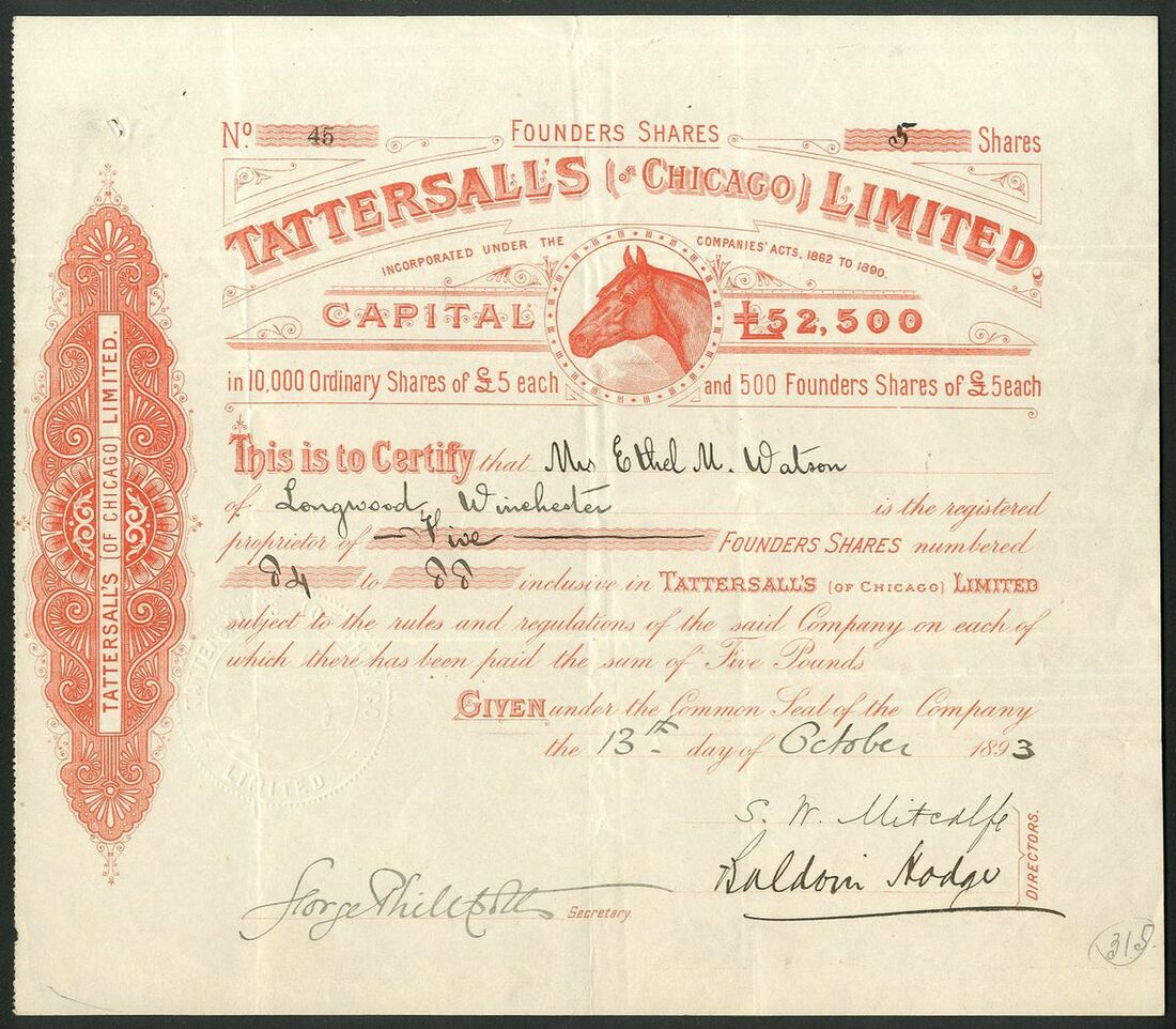 Great Britain/U.S.A.: Tattersalls (of Chicago) Ltd., £5 founders shares, 189[3], #45, horse's head at top centre, scrollwork at left, red. Racehorse auctioneer, founded in 1766 by Richard Tattersall. This company was an effort to establish the company in Chicago (there was a similar company for New York) which was successful until the onset of the Great Depression when the building fell into disrepair. Great Boxing fights were also a feature of Tattersalls. VF and scarce.