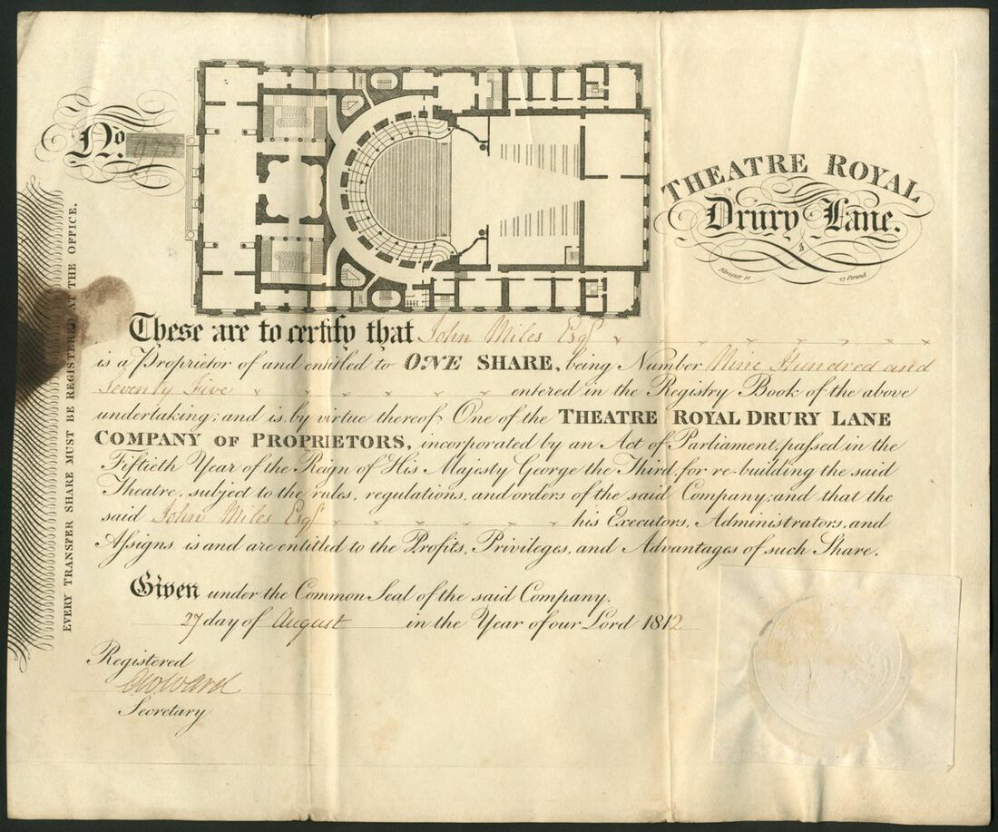 Great Britain: Theatre Royal, Drury Lane, certificate for 1 share, 181[2], #975, large plan of the theatre at top left, title to right, black on thick paper, paper seal at bottom right. The company was formed following the disastrous fire of 1809 that destroyed the previous structure. The new theatre, designed by Benjamin Wyatt, opened in 1812. A restoration project was announced in 2013 by Andrew Lloyd-Webber's Really Useful Theatres group who own the theatre. Usual two folds, ink stain at left, VF and scarce.