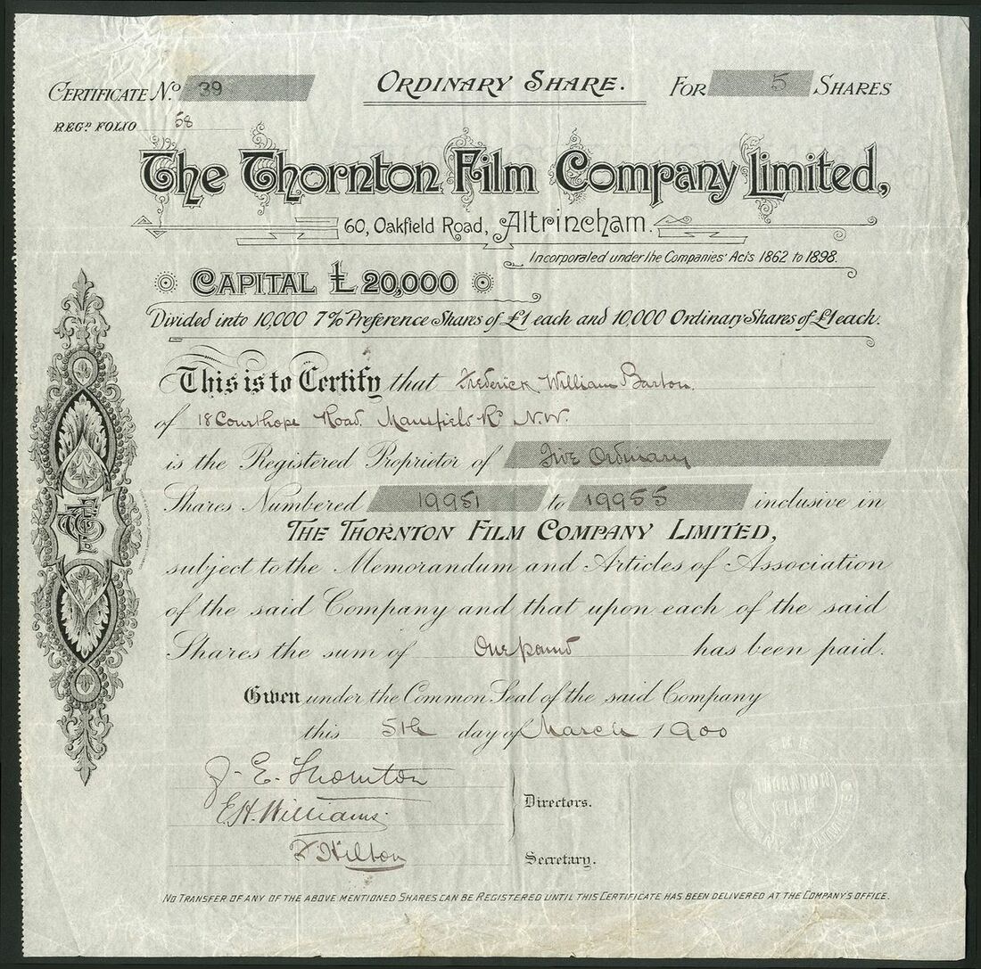 Great Britain: Thornton Film Company Limited, Altrincham, Cheshire, £1 ordinary shares, 1[900], #39, signed by John Edward Thornton as director, scollwork left, black. Thornton had already been making cameras of his own design and this company was formed to make 'Daypack' celluloid film. NO RESERVE. AVF and scarce.