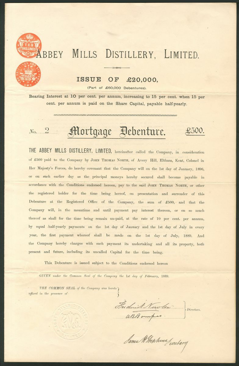 Great Britain: Abbey Mills Distillery Ltd., 10% debenture for £500, 1889, #2 of only 40 issued, large format piece, plain printing, 4 pages. Distillery in West Ham, Essex (London since 1965). Named after the old ruined West Ham Abbey the distillery had been owned by several persons prior to being acquired by this company. Demolished in 1903. VF and rare.