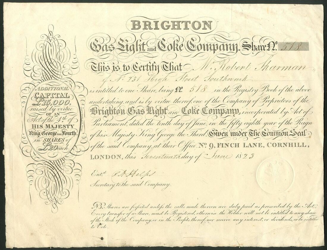 Great Britain: Brighton Gas Light and Coke Company, £20 share, 18[23], #518, black on thick paper. Works at Black Rock, just outside Brighton. In 1882 amalgamated with its rival, the Brighton & Hove General Gas Company, formed in 1825 and nationalised in 1949. GVF.