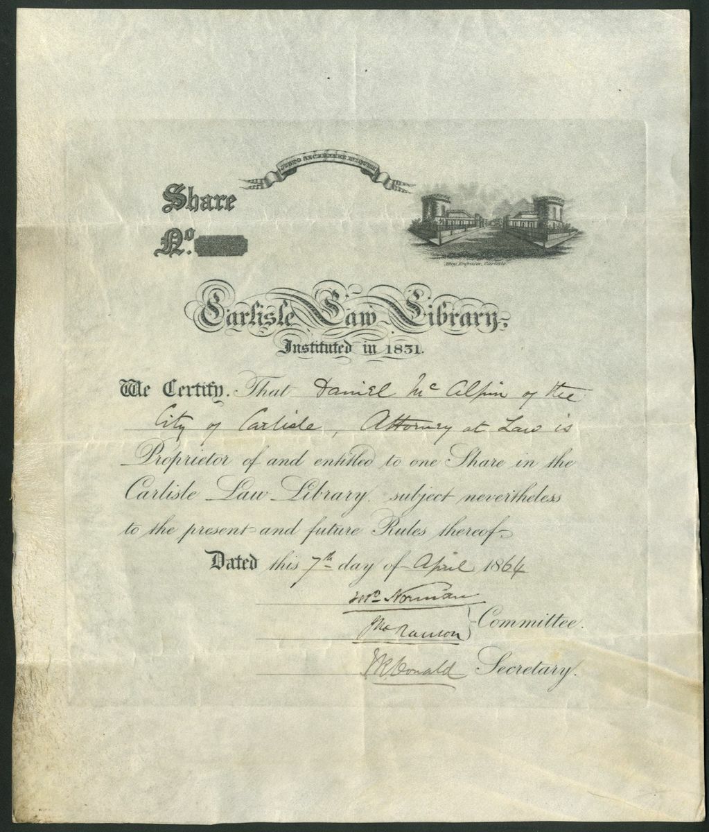 Great Britain: Carlisle Law Library, certificate for 1 share, 18[64], number somewhat feint, black printing on vellum, on the 1830's stock, vignette of Carlisle City walls. Instituted in 1831 at the Public Rooms in Devonshire Street. It contained some 600 volumes. In the same building as the general Library of some 10,000 volumes. The Law Library was still in existence in the 1950's but no mention in recent years. Probably absorbed into the County library. VF and rare [R10]