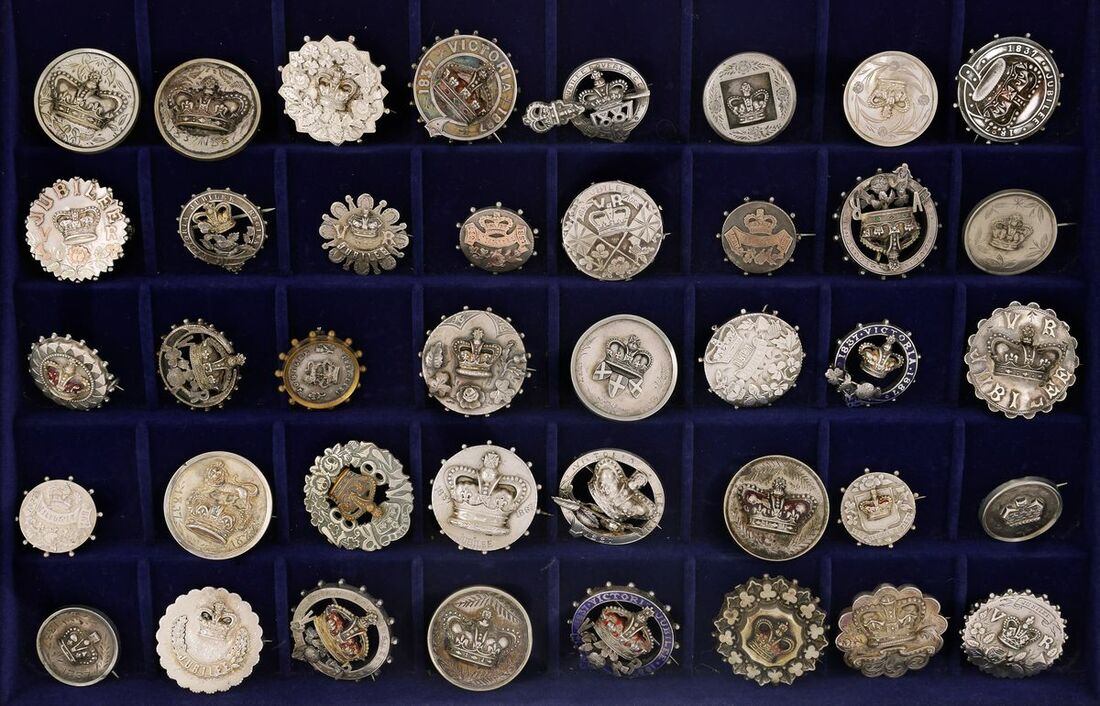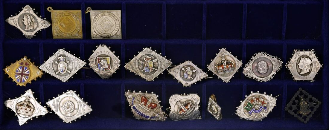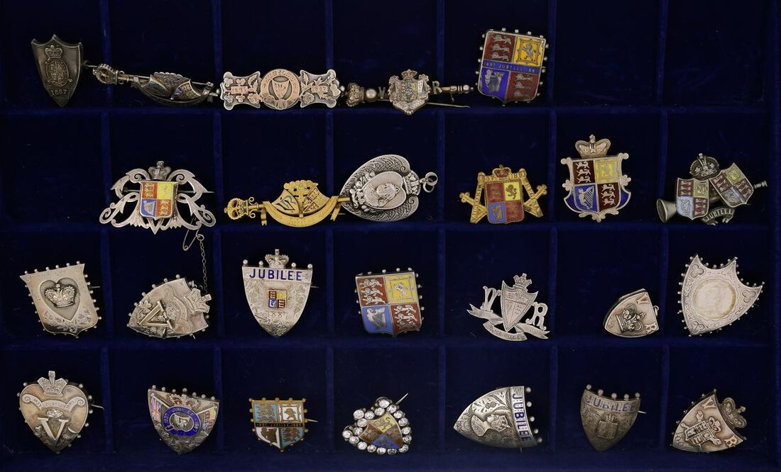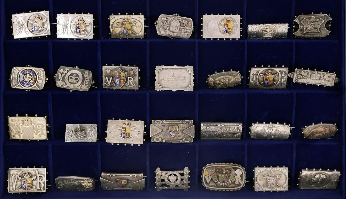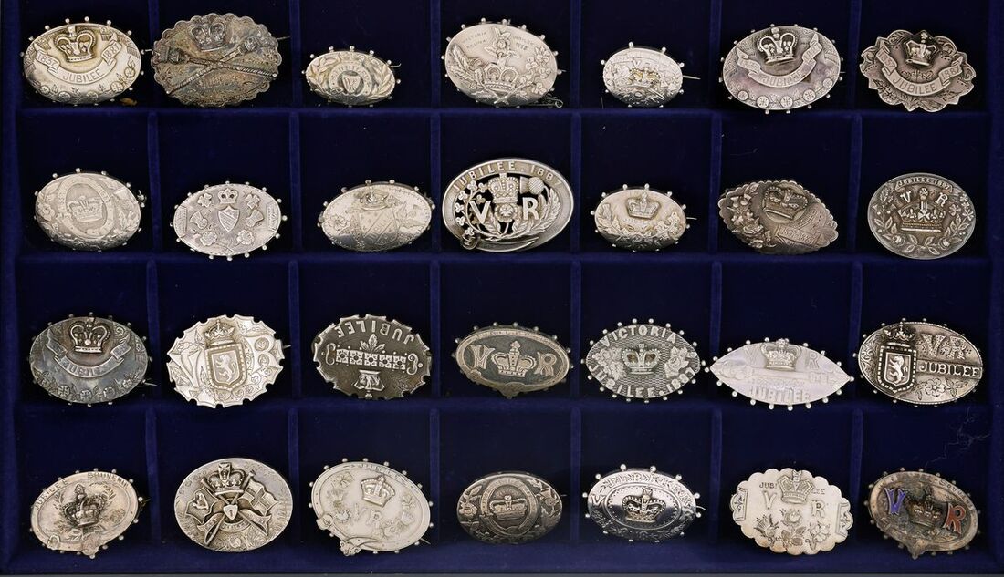 From the Robin Hunt Reference Collection of Royal Memorabilia | Victoria (1837-1901), 'Golden Jubilee' Commemorative Silver and Base Metal Pin Brooches, 1887 (approx. 370) | struck in a number of designs largely including, Circular, Oval, Spade and Rectangular Brooches adorned with Crowns; Cypher; Royal Arms and Portrait, including makers marks for, Birmingham, S. Bros; Rose & Brough; B. Bros; Richard John Green; Henry Walker; James Walter Tiptaft; Arthur Johnson Smith; Sheffield, John Round & Son Ltd, Chester, Hollis & Newman and many others; finally, 9-Carat Garter and Crown Pin Badge, by A&L of London, a handful with damage to the pin, yet largely all in full working order, a most pleasingly intricate and highly decorative collection documenting the manner in which the Jubilee was commemorated, very fine to extremely fine (approx. 370)