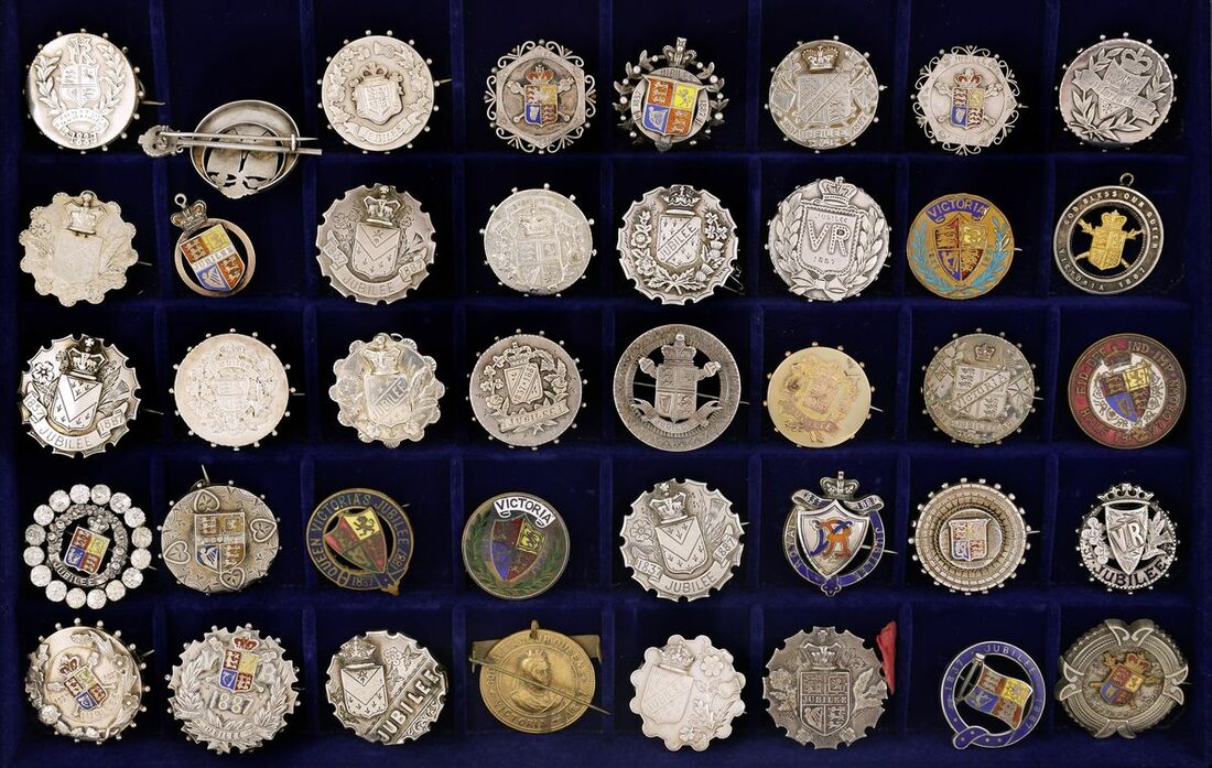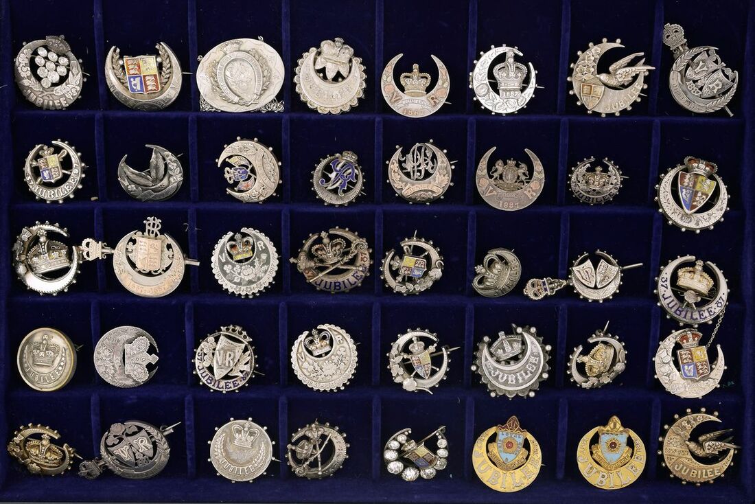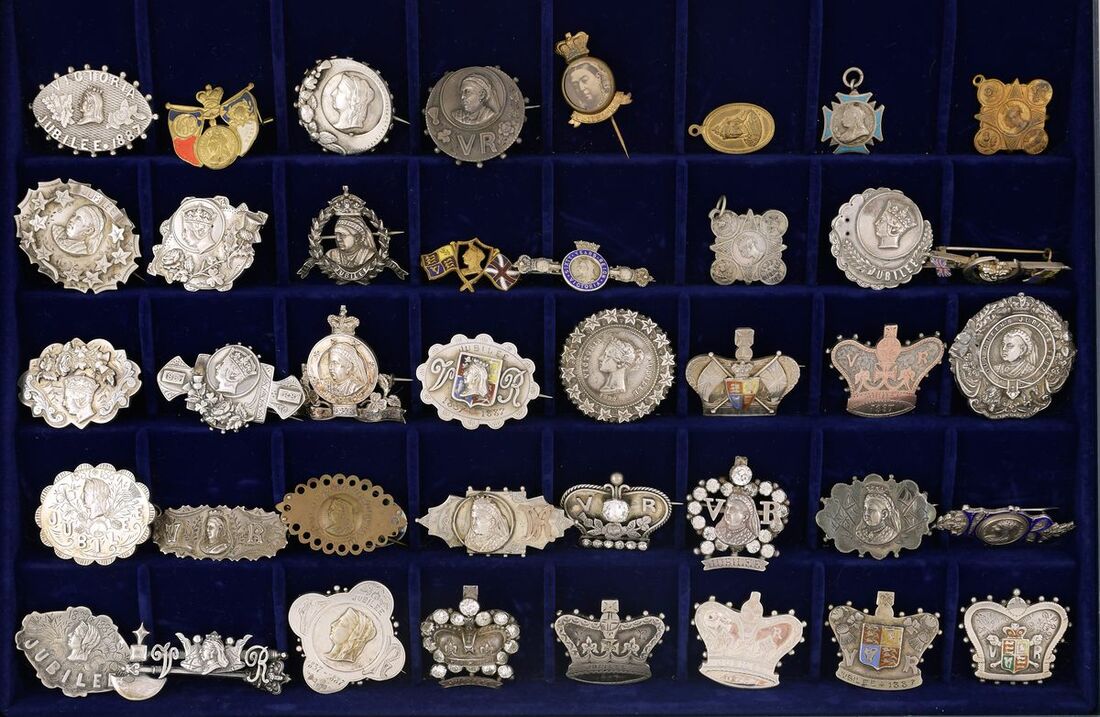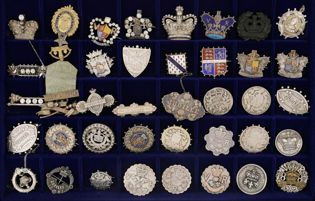 From the Robin Hunt Reference Collection of Royal Memorabilia | Victoria (1837-1901), 'Golden Jubilee' Commemorative Silver and Base Metal Pin Brooches, 1887 (approx. 292) | struck in a number of designs including, Circular, Oval, Cross, Crescent and Rectangular Brooches adorned with Crowns; Cypher; Royal Arms and Portrait, including makers marks for, Birmingham, Rolason Brothers; Arthur Johnson Smith; James Swann; Joseph Cook; Richard John Wakefield; Chester, Joseph Fray; Albert Curtis and many others finally, 9-Carat Oval and Emblem Brooch, by H&N, a handful with damage to the pin, yet largely all in full working order, a most pleasingly intricate and highly decorative collection documenting the manner in which the Jubilee was commemorated, very fine to extremely fine; additionally, Registered Coronation Jewellery Design Catalogues (2), designs by J. N. Masters of Rye many of the designs illustrated feature within this collection, extremely fine (approx. 292)