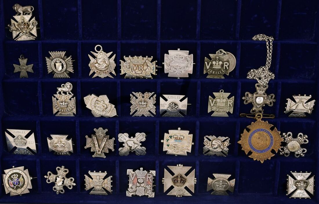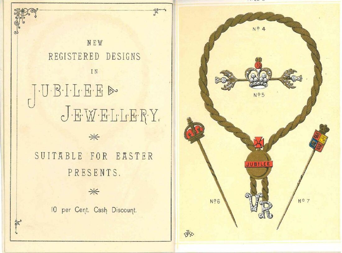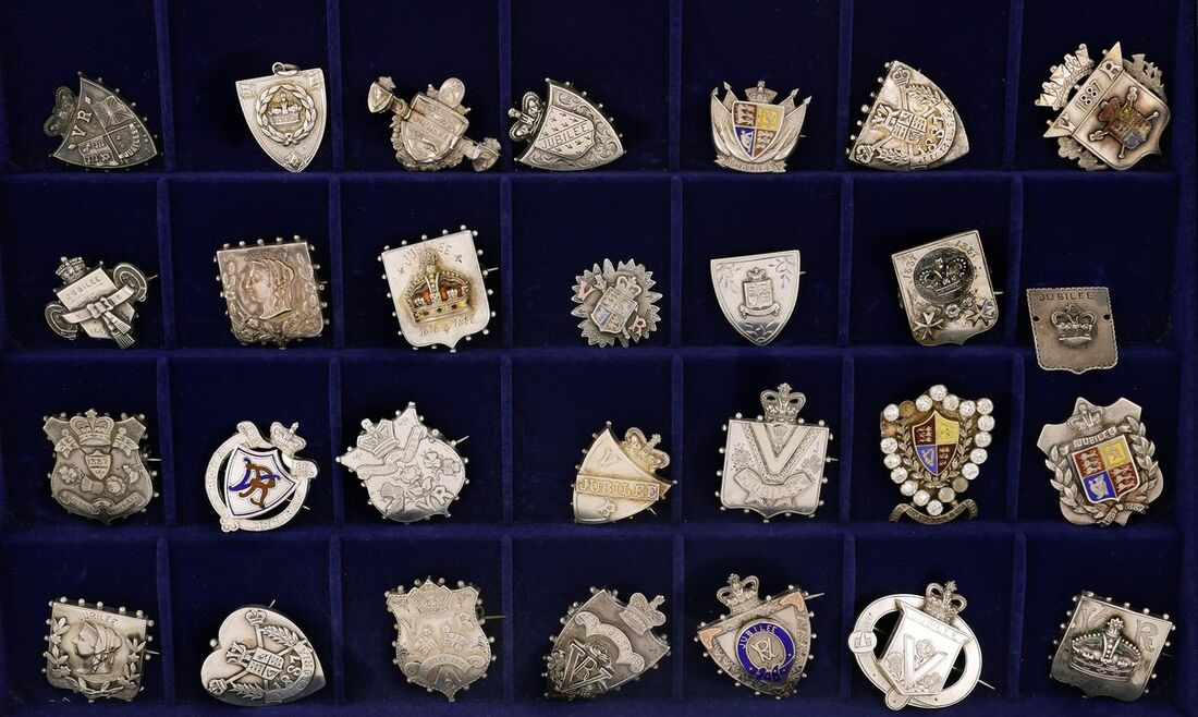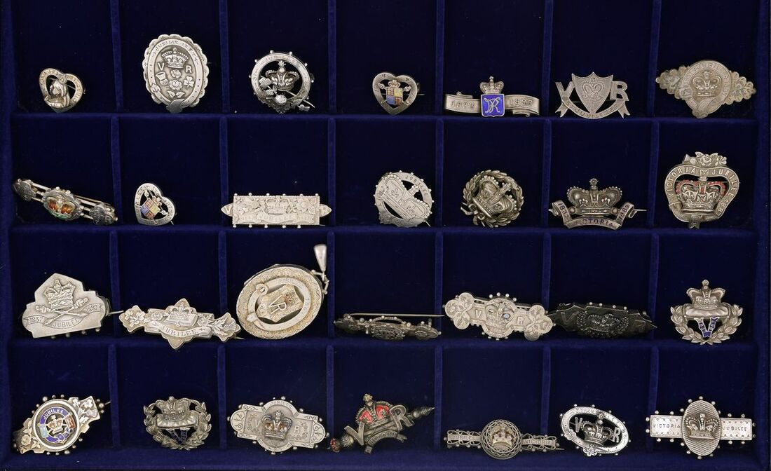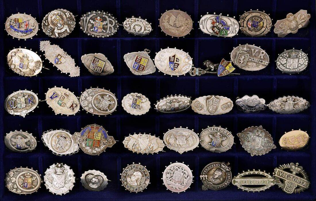 From the Robin Hunt Reference Collection of Royal Memorabilia | Victoria (1837-1901), 'Golden Jubilee' Commemorative Silver and Base Metal Pin Brooches, 1887 (approx. 292) | struck in a number of designs including, Circular, Oval, Cross, Crescent and Rectangular Brooches adorned with Crowns; Cypher; Royal Arms and Portrait, including makers marks for, Birmingham, Rolason Brothers; Arthur Johnson Smith; James Swann; Joseph Cook; Richard John Wakefield; Chester, Joseph Fray; Albert Curtis and many others finally, 9-Carat Oval and Emblem Brooch, by H&N, a handful with damage to the pin, yet largely all in full working order, a most pleasingly intricate and highly decorative collection documenting the manner in which the Jubilee was commemorated, very fine to extremely fine; additionally, Registered Coronation Jewellery Design Catalogues (2), designs by J. N. Masters of Rye many of the designs illustrated feature within this collection, extremely fine (approx. 292)