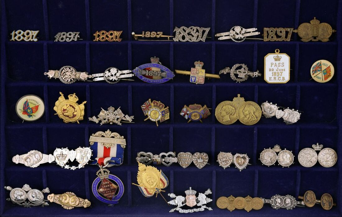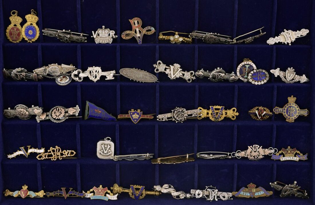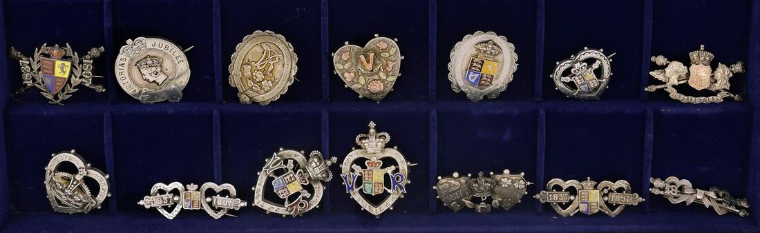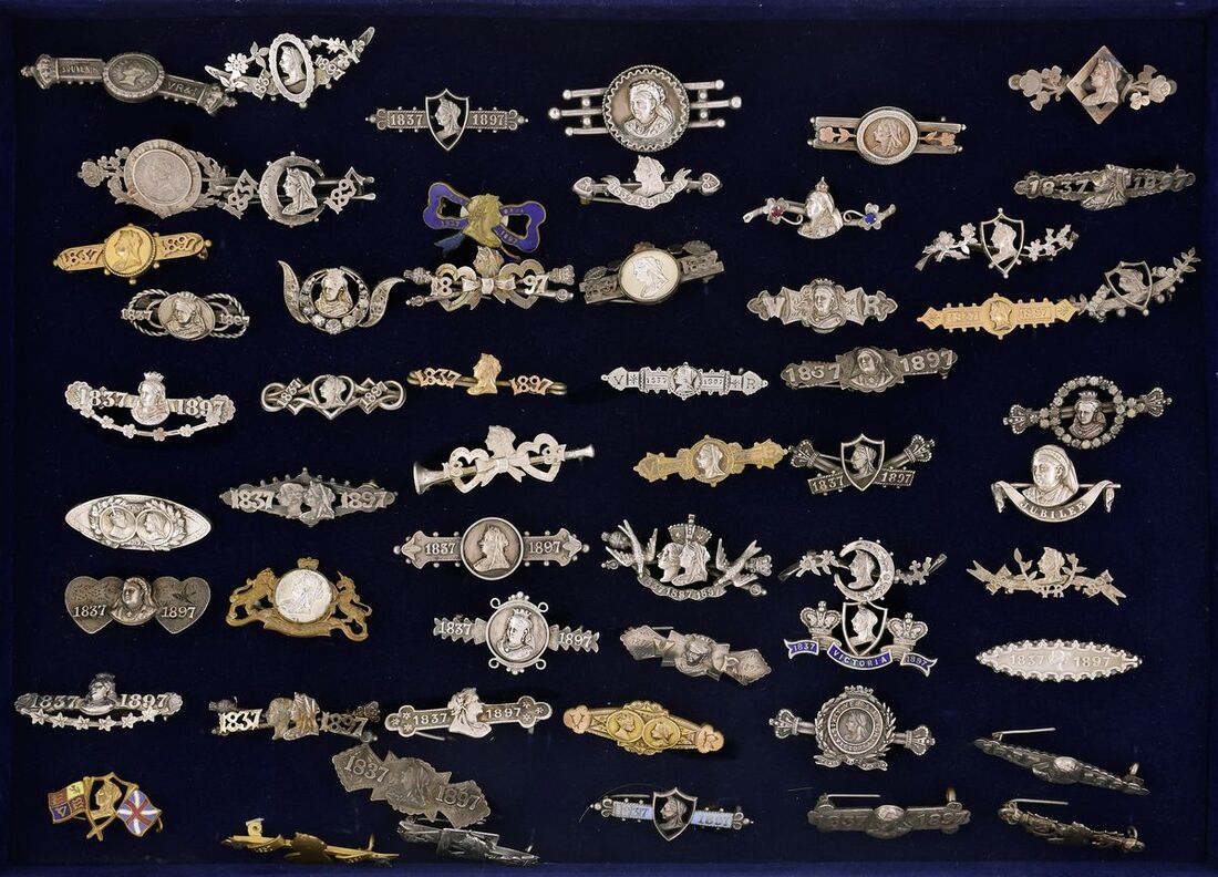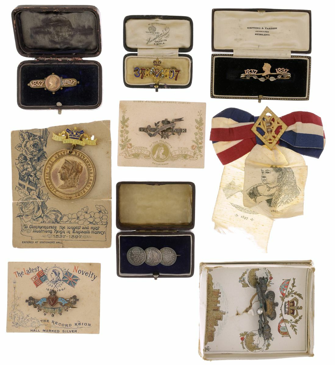 From the Robin Hunt Reference Collection of Royal Memorabilia | Victoria (1837-1901) 'Diamond Jubilee' Commemorative Silver and Base Metal Pin Brooches, 1897 (approx. 383) | struck in a number of designs including, Portrait Pin Brooches; Long Pin Brooches with Cypher, Crowns and Emblems; Diamond Pin Brooches; Heart Pin Brooches; and others, including makers marks for, Birmingham, Smith Bros [?]; Richard John Wakefield; James Fenton; Joseph Gloster; Henry Cook; Charles Edward Soloman; and others, a broad range of intricate and highly decorative brooches, reflective of the period's fashion for such items, some with damage to the pin, yet mostly all in full working order, very fine to extremely fine (approx. 383)