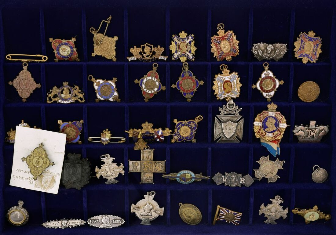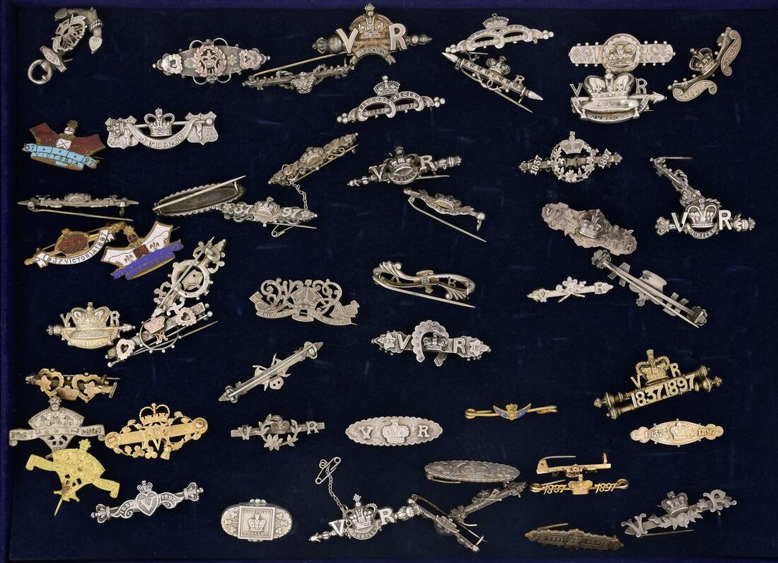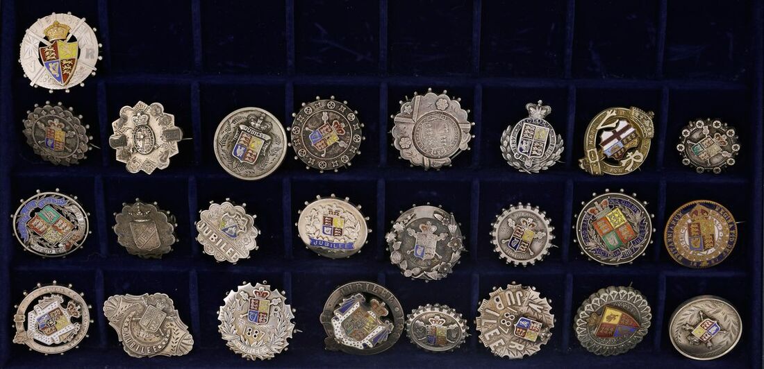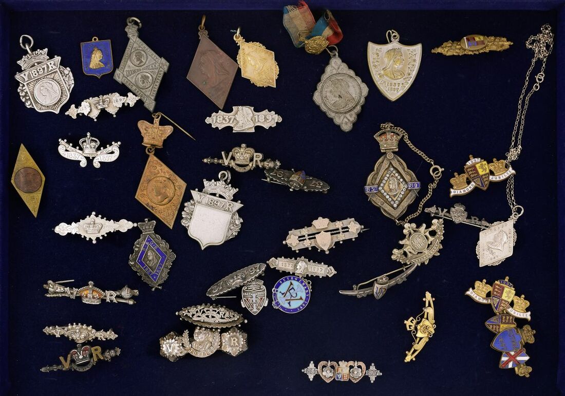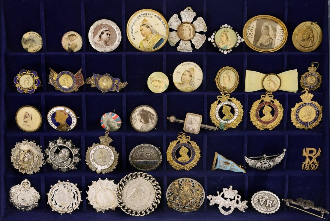 From the Robin Hunt Reference Collection of Royal Memorabilia | Victoria (1837-1901) 'Diamond Jubilee' Commemorative Silver and Base Metal Pin Brooches, 1897 (approx. 383) | struck in a number of designs including, Portrait Pin Brooches; Long Pin Brooches with Cypher, Crowns and Emblems; Diamond Pin Brooches; Heart Pin Brooches; and others, including makers marks for, Birmingham, Smith Bros [?]; Richard John Wakefield; James Fenton; Joseph Gloster; Henry Cook; Charles Edward Soloman; and others, a broad range of intricate and highly decorative brooches, reflective of the period's fashion for such items, some with damage to the pin, yet mostly all in full working order, very fine to extremely fine (approx. 383)