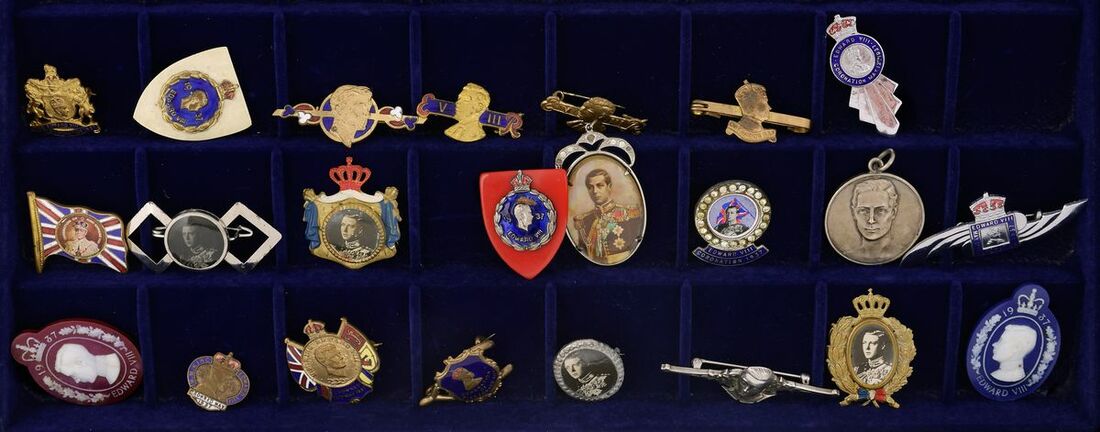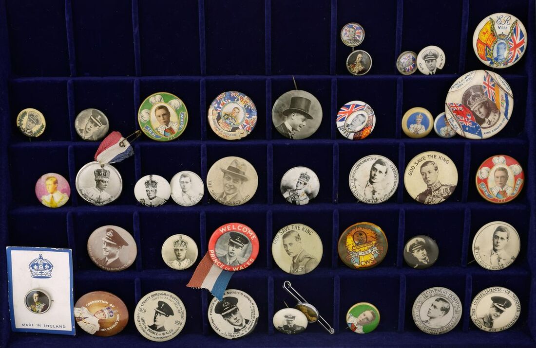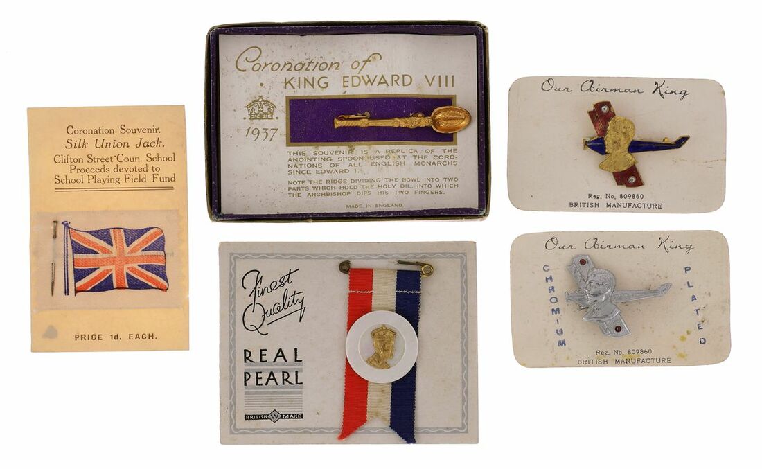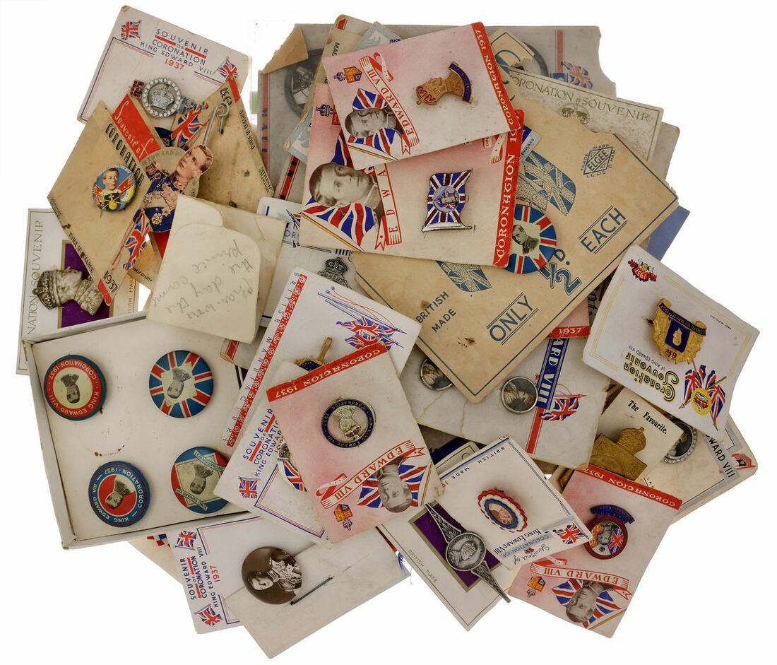 From the Robin Hunt Reference Collection of Royal Memorabilia | Edward VIII (1936) Coronation and Royal Visit Badges (approx. 224) | including, Portrait Badges, (172); Cypher and Emblem Badges (52), struck in base metal and enamel, including, Replica Anointing Spoon Pin Badge; 'Our Airman King' Pin Badge; Portrait Pin Badge with real pearl disk; School Playing Field Fund, Silk Union Jack Flag Pin; Duchy of Cornwall, 1909 Visit Pin Badge, many with their original paper packaging, a poignant collection of royal and historical memorabilia crafted in an array of designs and created to mark the Coronation that never took place, very fine to extremely fine (approx. 224)