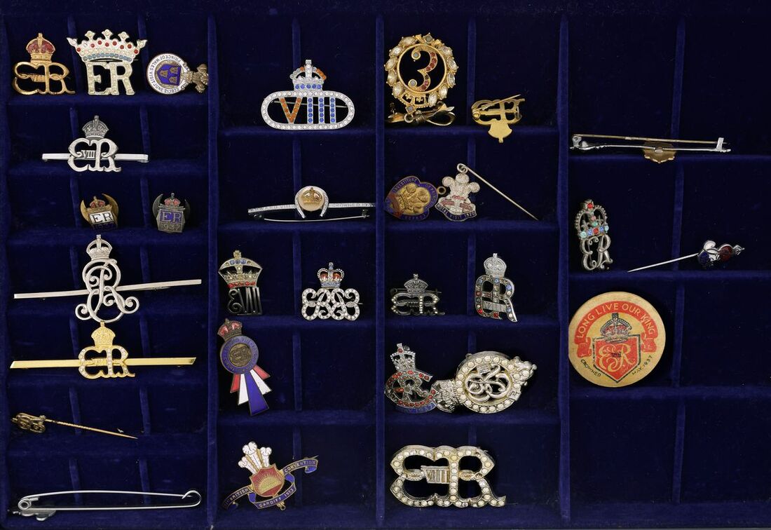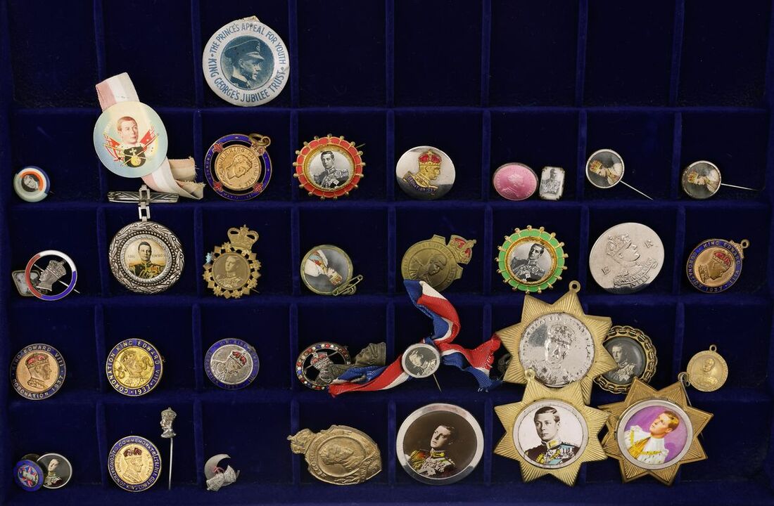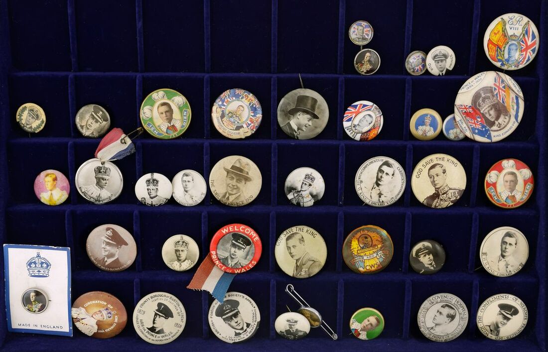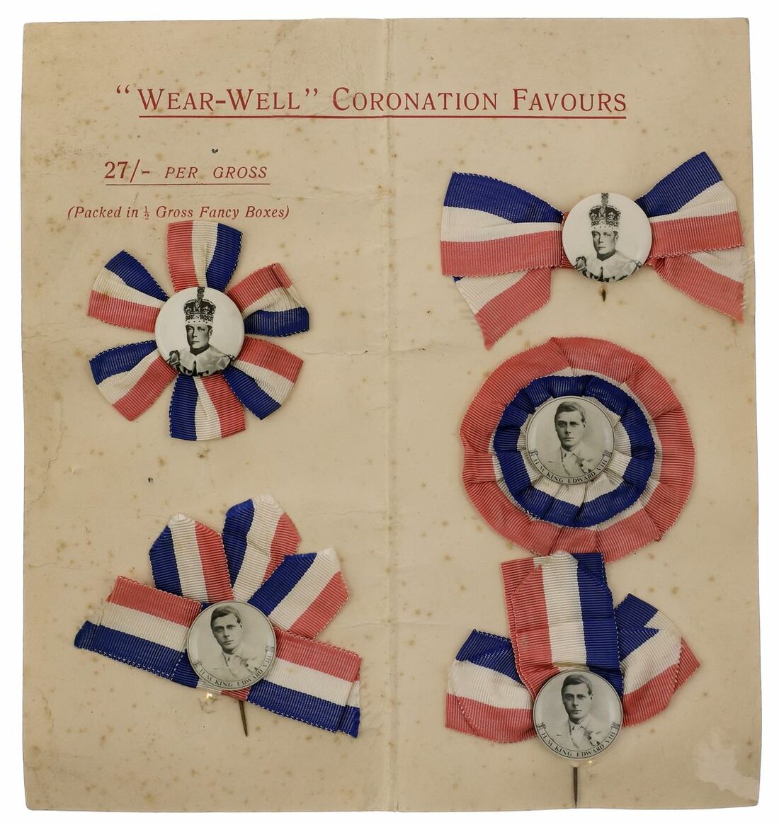 From the Robin Hunt Reference Collection of Royal Memorabilia | Edward VIII (1936) Coronation and Royal Visit Badges (approx. 224) | including, Portrait Badges, (172); Cypher and Emblem Badges (52), struck in base metal and enamel, including, Replica Anointing Spoon Pin Badge; 'Our Airman King' Pin Badge; Portrait Pin Badge with real pearl disk; School Playing Field Fund, Silk Union Jack Flag Pin; Duchy of Cornwall, 1909 Visit Pin Badge, many with their original paper packaging, a poignant collection of royal and historical memorabilia crafted in an array of designs and created to mark the Coronation that never took place, very fine to extremely fine (approx. 224)