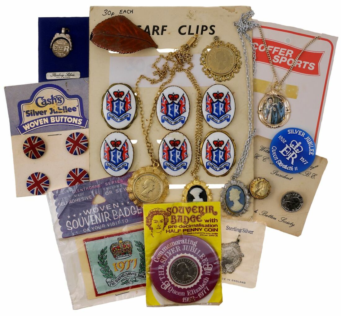From the Robin Hunt Reference Collection of Royal Memorabilia | Elizabeth II (1952-2022), Jubilant Assortment of Official and Unofficial 'Silver Jubilee' Pin Badges and Ethemera 1977 (88) | including, Hyde Park Jubilee Exhibition; National Portrait Gallery; Olympus Cameras; Windsor & Newton; Primrose Hill School Fair; Merseyside County Council Road Safety; Thames Water; Sun Life Insurance; National Rail; Speedway Star; London Zoo and Whispnade Park; Penketh Carnival; Masons "Pop"; Save the Children; Fleet Review at Spithead; and regional examples from, Cookham; Whitefield; Blackpool; Buckmore Park; Berkeley Square; Havering and many more, a most interesting assortment of Jubilee memorabilia, providing a socio-historical snapshot of British brands, companies and events at the time of the Silver Jubilee, many of pleasing artistic merit and design, including that of the official emblem, very fine to extremely fine, all in working order, in an array of sizes (88)