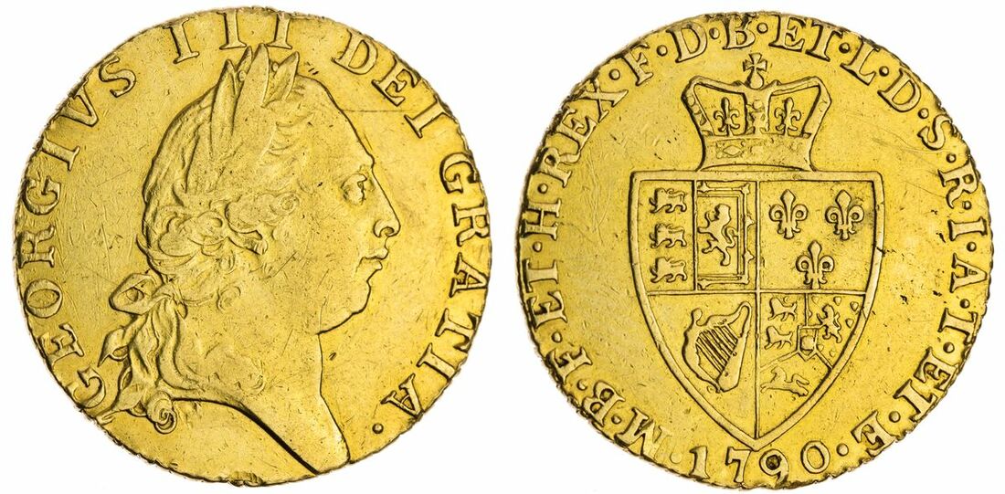 George III (1760-1820), 'Spade' Guinea, 1790, fifth laureate head right, rev. crowned 'spade' shield, seven strings to harp, edge chevron milled, 8.30g, 12h (MCE 394; Farey 1290; EGC 718; Spink 3739), hastily removed from a mount with contact marks at 12 and 6 o'clock, lightly polished and scuffed in fields, otherwise residually lustrous, struck details, bolder than fine