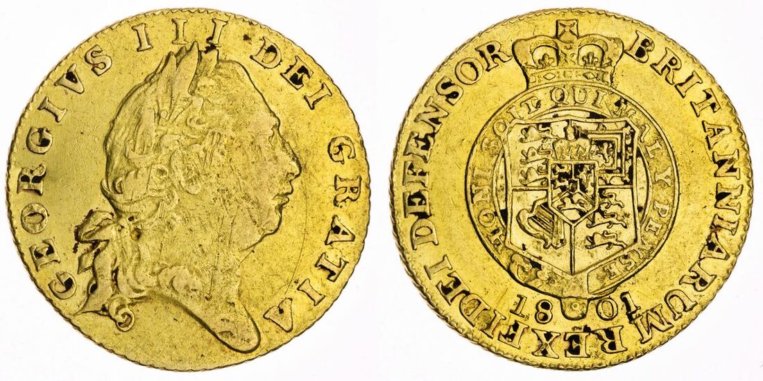 (g) George III (1760-1820), 'Garter' Half-Guinea, 1801, sixth laureate head right, rev. crowned shield in Garter, edge obliquely milled, 4.18g, 1h (MCE 439; EGC 845; Stratos 44; Spink 3736), lightly cleaned with surface and haymarking to portrait, otherwise about very fine