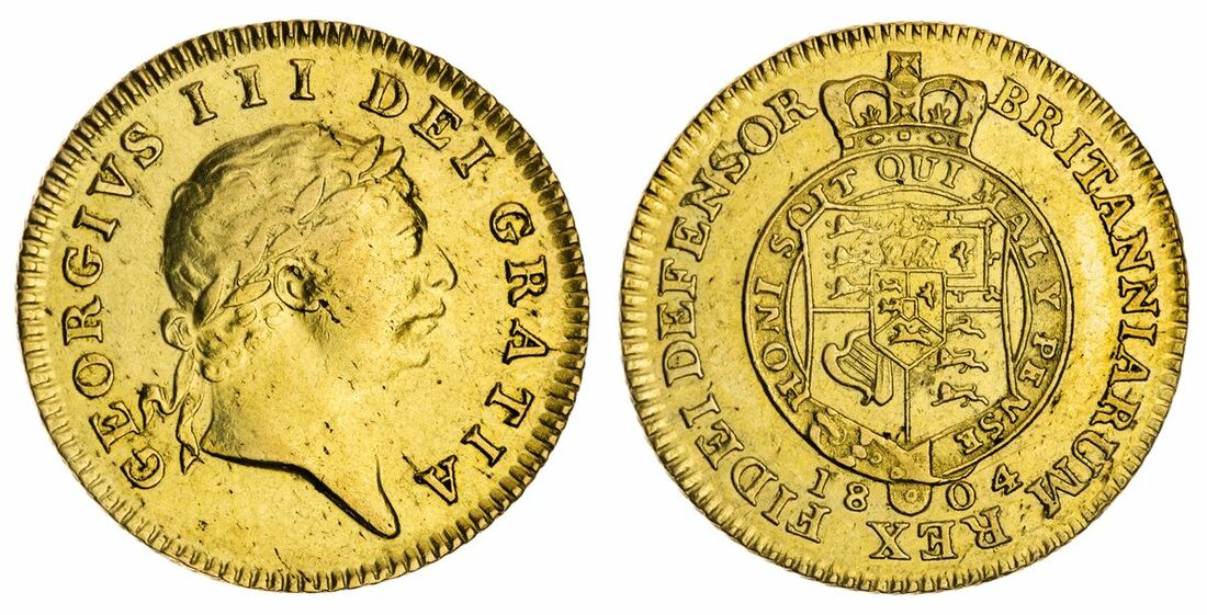 (g) George III (1760-1820), 'Garter' Half-Guinea, 1804, seventh laureate head right, rev. crowned shield in Garter, edge obliquely milled, 4.16g, 1h (MCE 442; EGC 849; Spink 3737), lightly cleaned, but residually lustrous, almost very fine