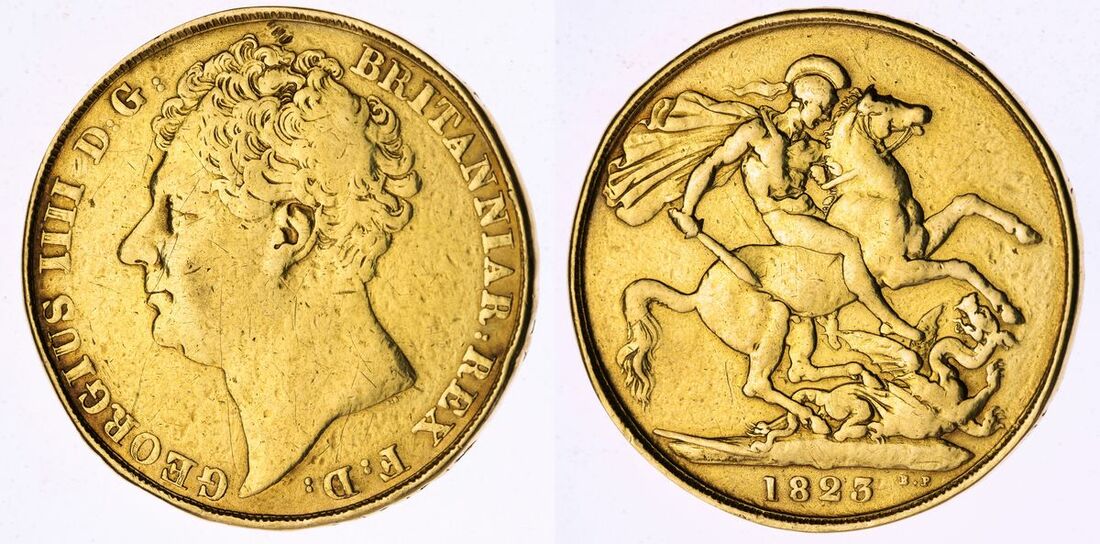 (g) George IV (1820-1830), Two-Pounds, 1823 IV, bare head left, rev. St. George and Dragon, edge lettered upwards, 15.67g, 6h (MCE 470; Marsh T6; EGC 945; Stratos 171; Spink 3798), sweated, polished and removed from solder mount, otherwise struck details fair, offered in its Bicentennial year