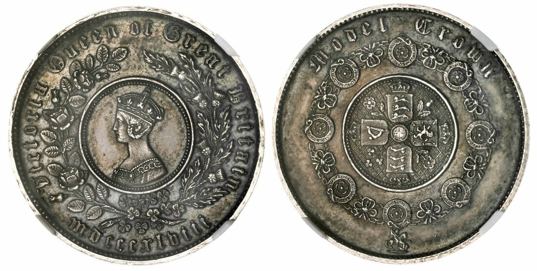 NGC AU58 | Victoria, Gothic "Model" Crown, 1848, in silver, by Joseph Moore for H Hyams, Barter I/7 [Rogers type 3], VICTORIA QUEEN OF GREAT BRITAIN around wreath, Gothic bust in centre, MDCCCXLVIII below, rev. MODEL CROWN, Order of the Garter, crowned cruciform shields in centre, edge plain, 7.94g, 1h (Rogers 209e; Barter 21), good very fine, and excessively rare, only one other known to commerce, in NGC holder, graded AU58 (Cert. #6295593-001)